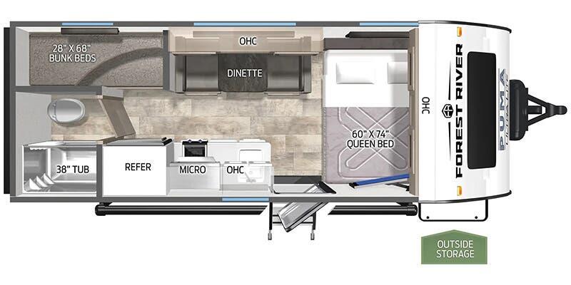 With any Puma Ultra Lite travel trailer by Palomino, you will experience a lighter weight RV that is eco-friendly and offers great fuel efficiency with maximum towability. The exterior offers an AlphaPly roofing membrane and a Darco wrapped underbelly for durability and years of use, a power tongue jack for easy setup, a Super Lube axle, a front diamond plate to protect against road debris, front and rear stabilizer jacks, plus solar and WiFi prep. Inside, there is LED ceiling lights, Beauflor linoleum for durability and easy cleanup, a decorative kitchen backsplash, contemporary hardware, light and bath fixtures for style, a divided silverware drawer for organization, and a 78" interior height.