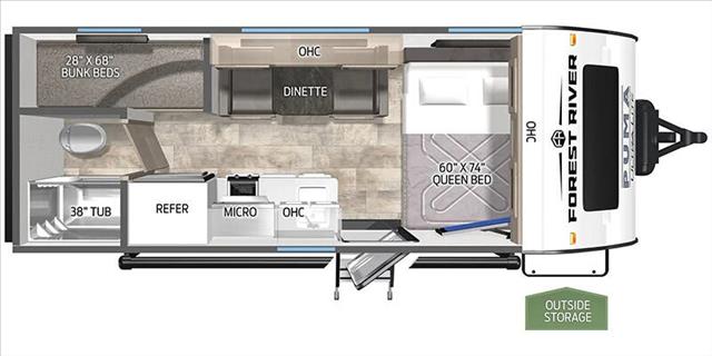 The family is ready, are you? After loading up your clothes, food and gear, you and your crew can camp with everything you need plus more inside this trailer. The kids will surely claim the bunks as their own, and you will have an RV queen bed up front. Two can dine at the booth dinette, or everyone can dine outside under the 12' electric awning after adding your camping chairs. The cook will have a two-burner cooktop and stainless steel microwave to whip up meals, and the residential refrigerator can hold the leftovers. And everyone will stay clean using the private toilet and tub/shower next to the bunks.