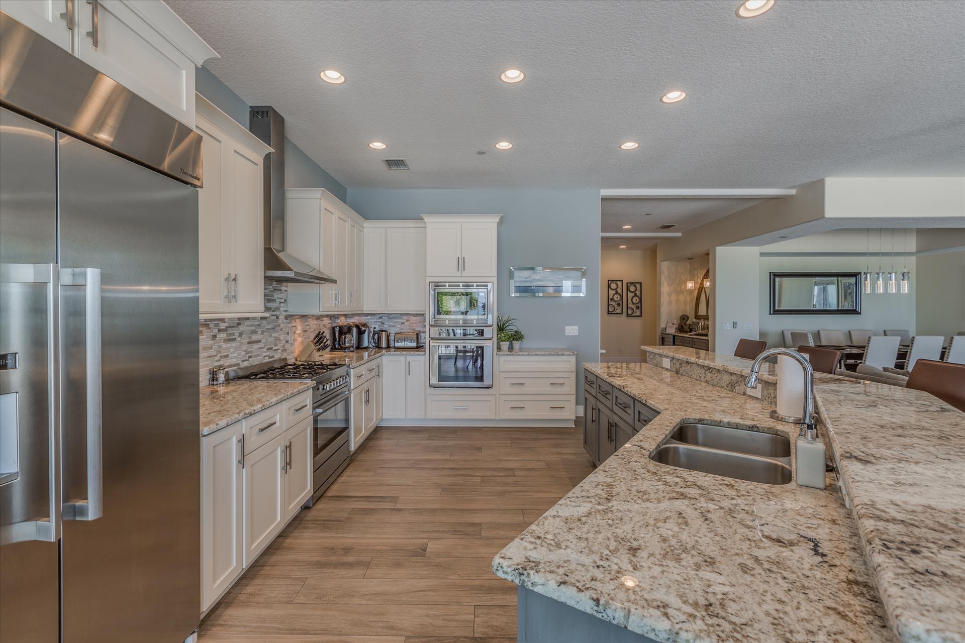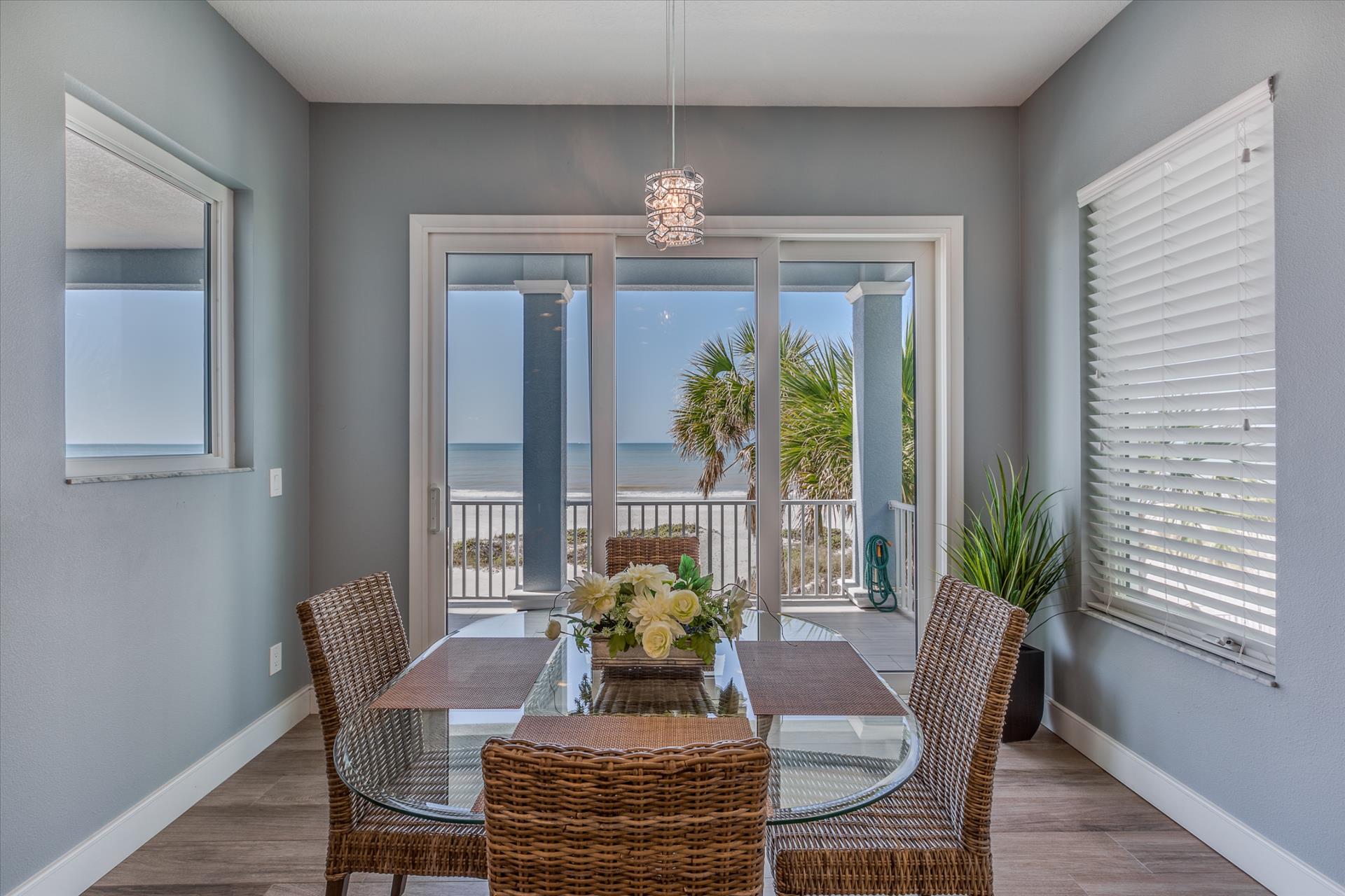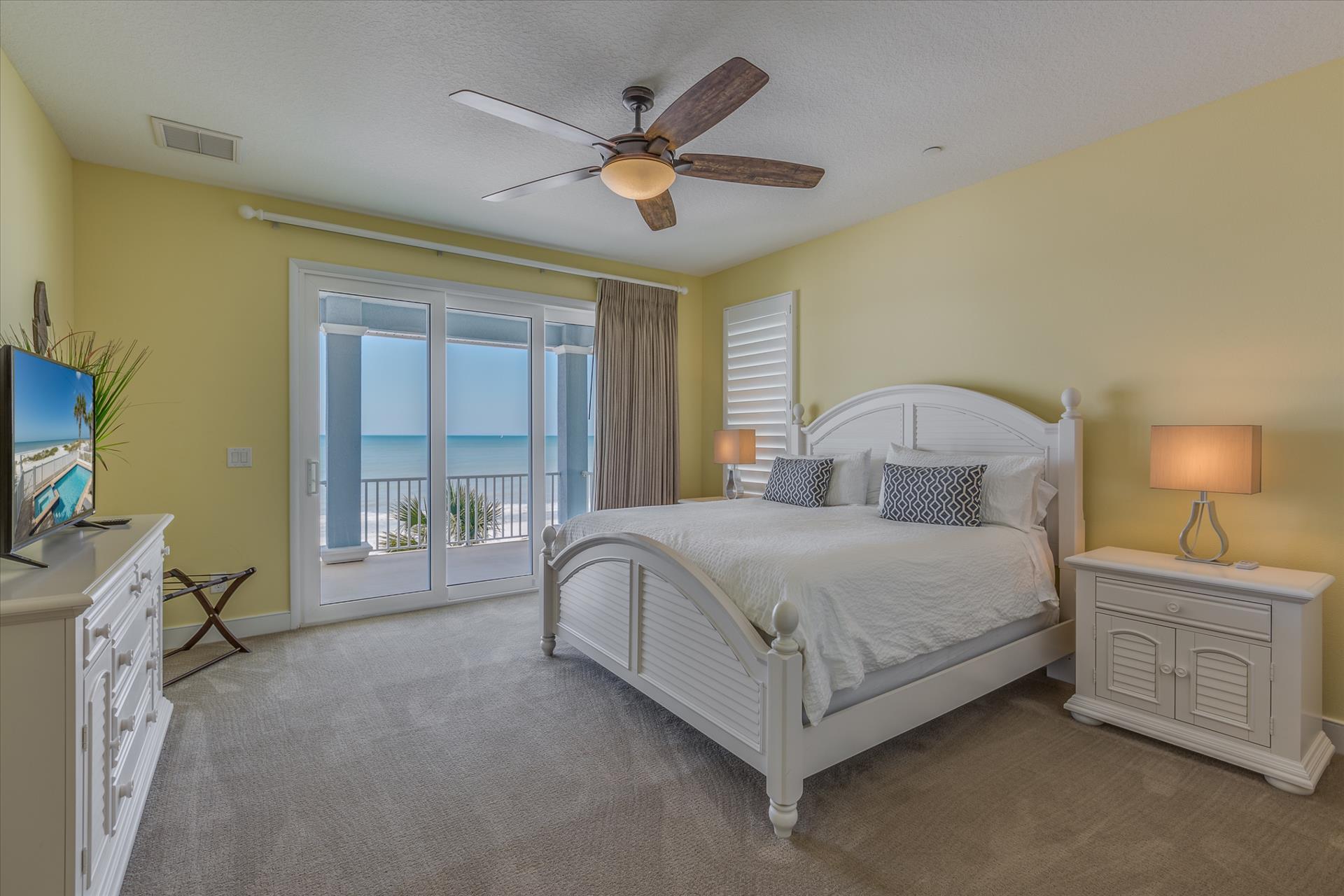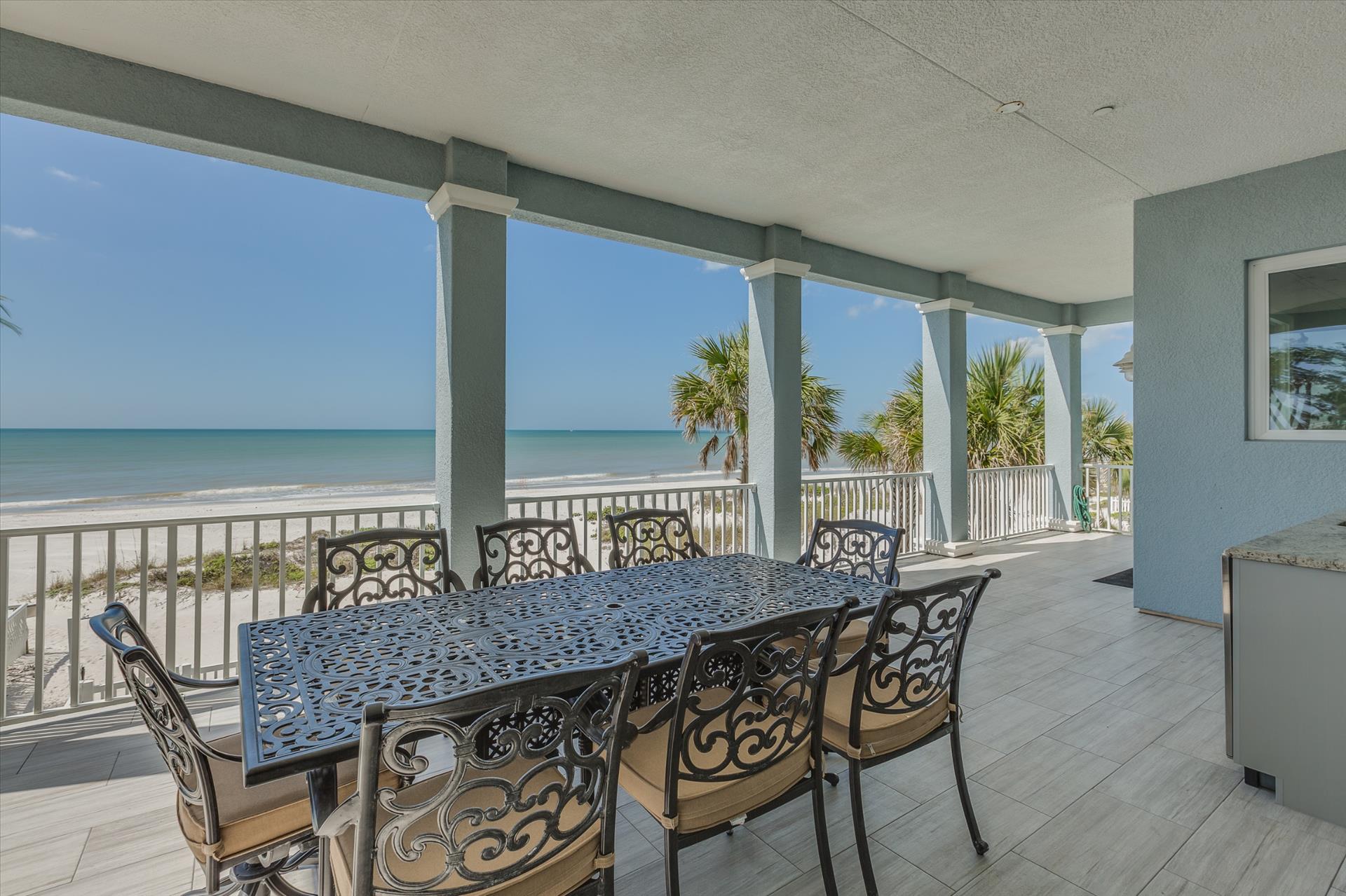 The second floor has a fantastic kitchen featuring a gas hob and stove, electric combo oven/microwave, refrigerator and dishwasher with seating for six at the island. There is also a wet bar and breakfast nook together with a formal dining area and a large sitting area with flat screen TV. There is a huge balcony that has sweeping views up and down the white sandy beaches of Indian Shores. There is an outdoor bar area, Weber grill as well as space for dining and relaxation.
