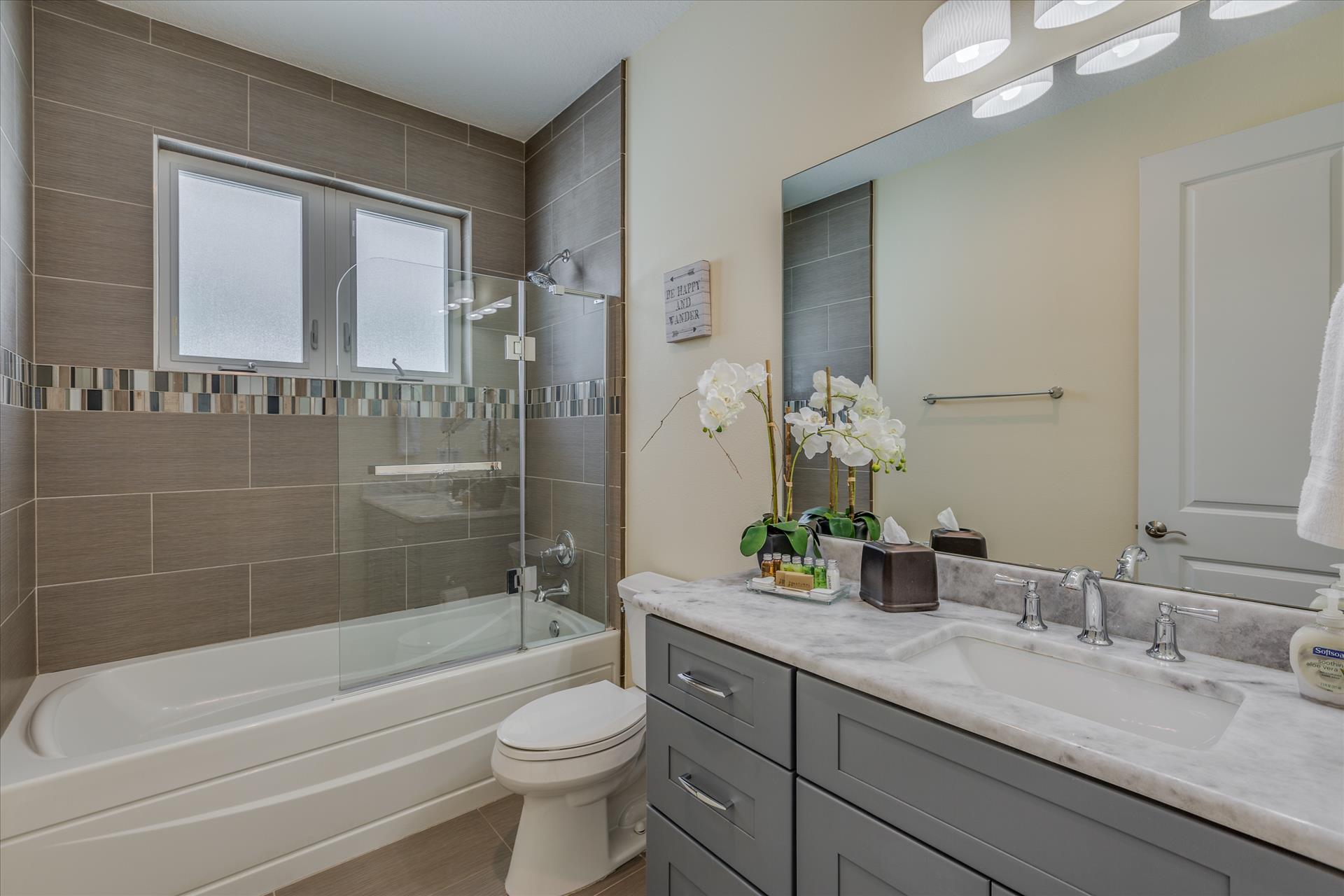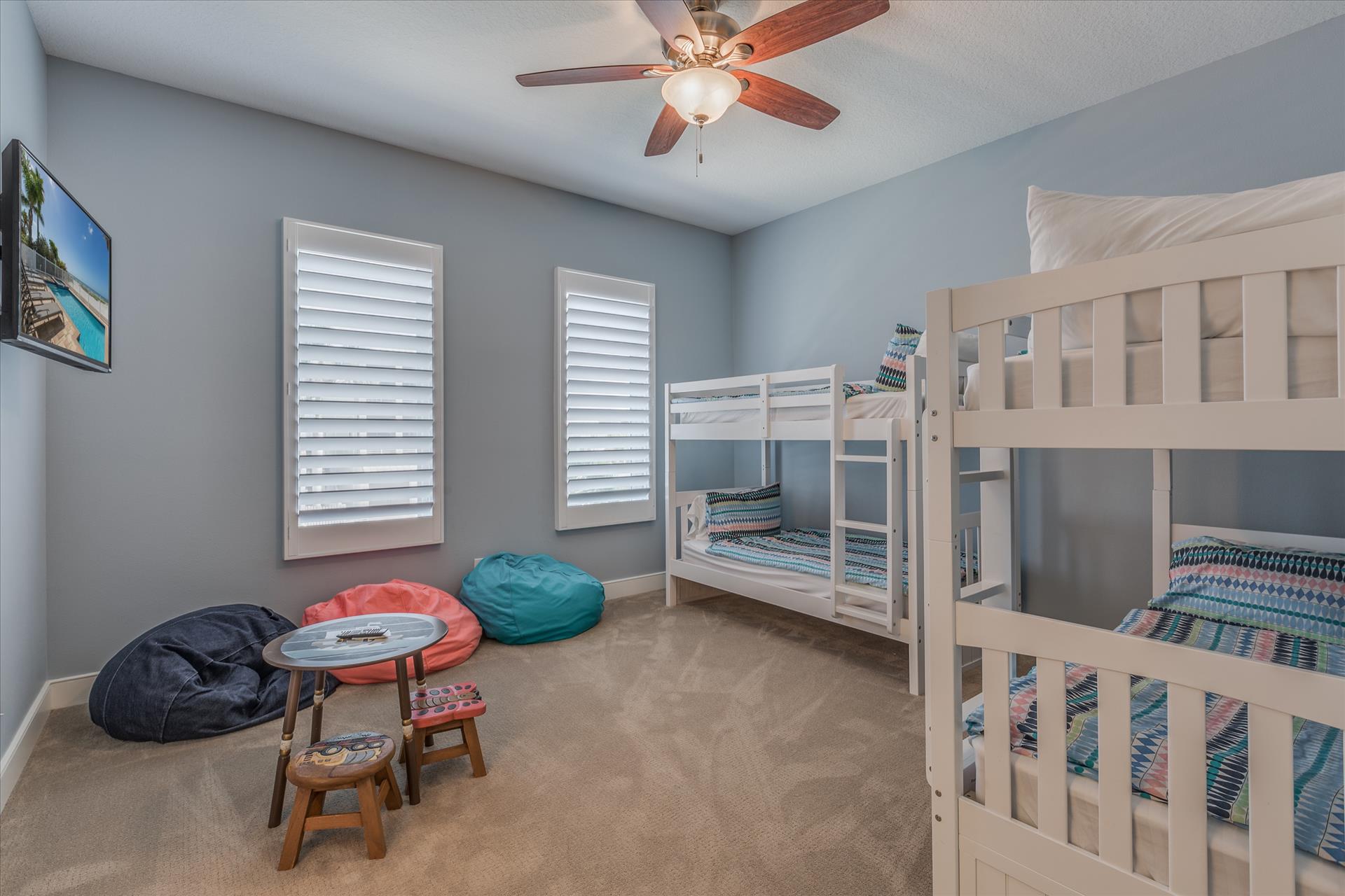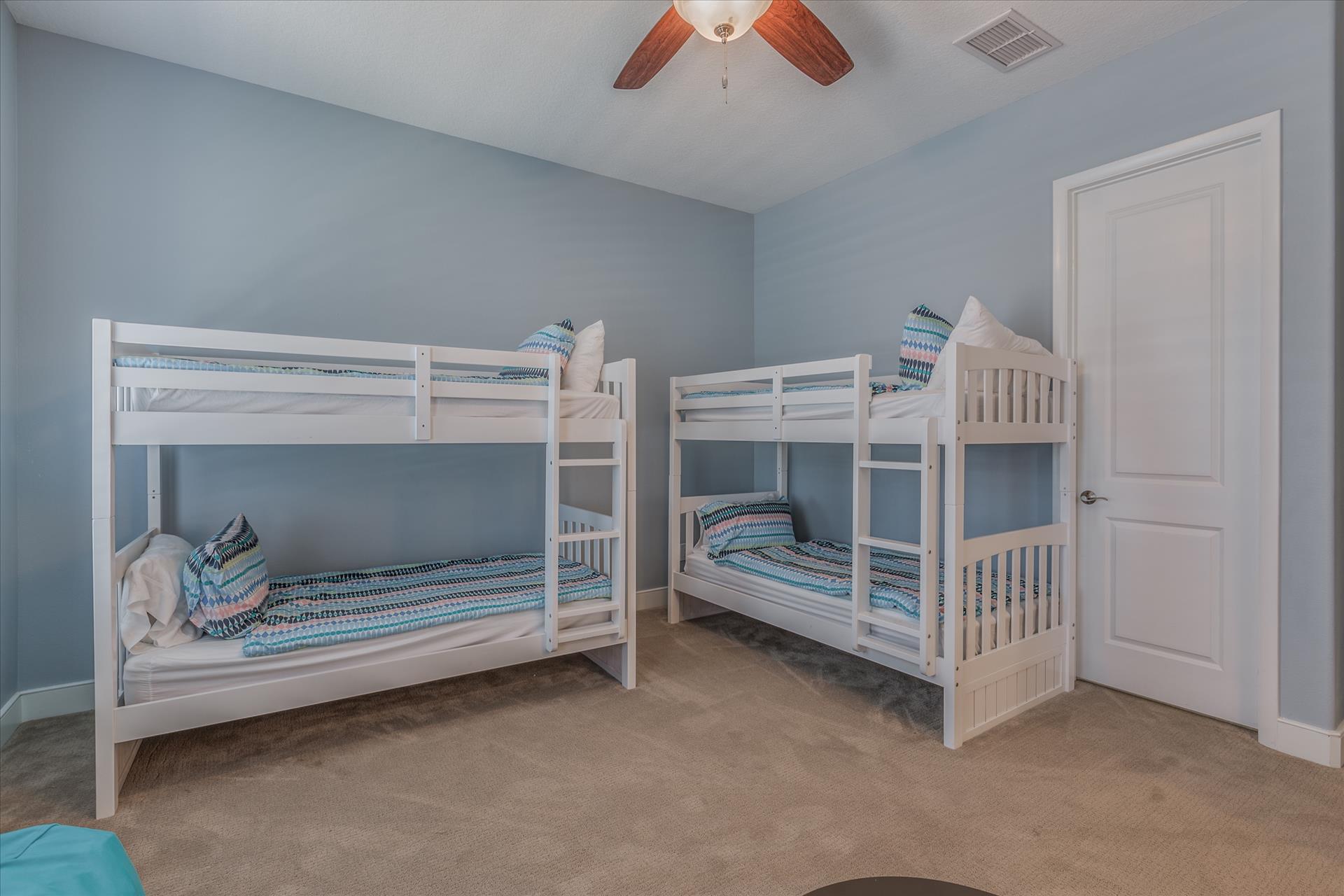 On this level are two bedrooms, one with a king bed, the other with two sets of bunk beds which will only accommodate children, these share a Jack'n'Jill bathroom. There is also a half bathroom for guests to use off of the living area.