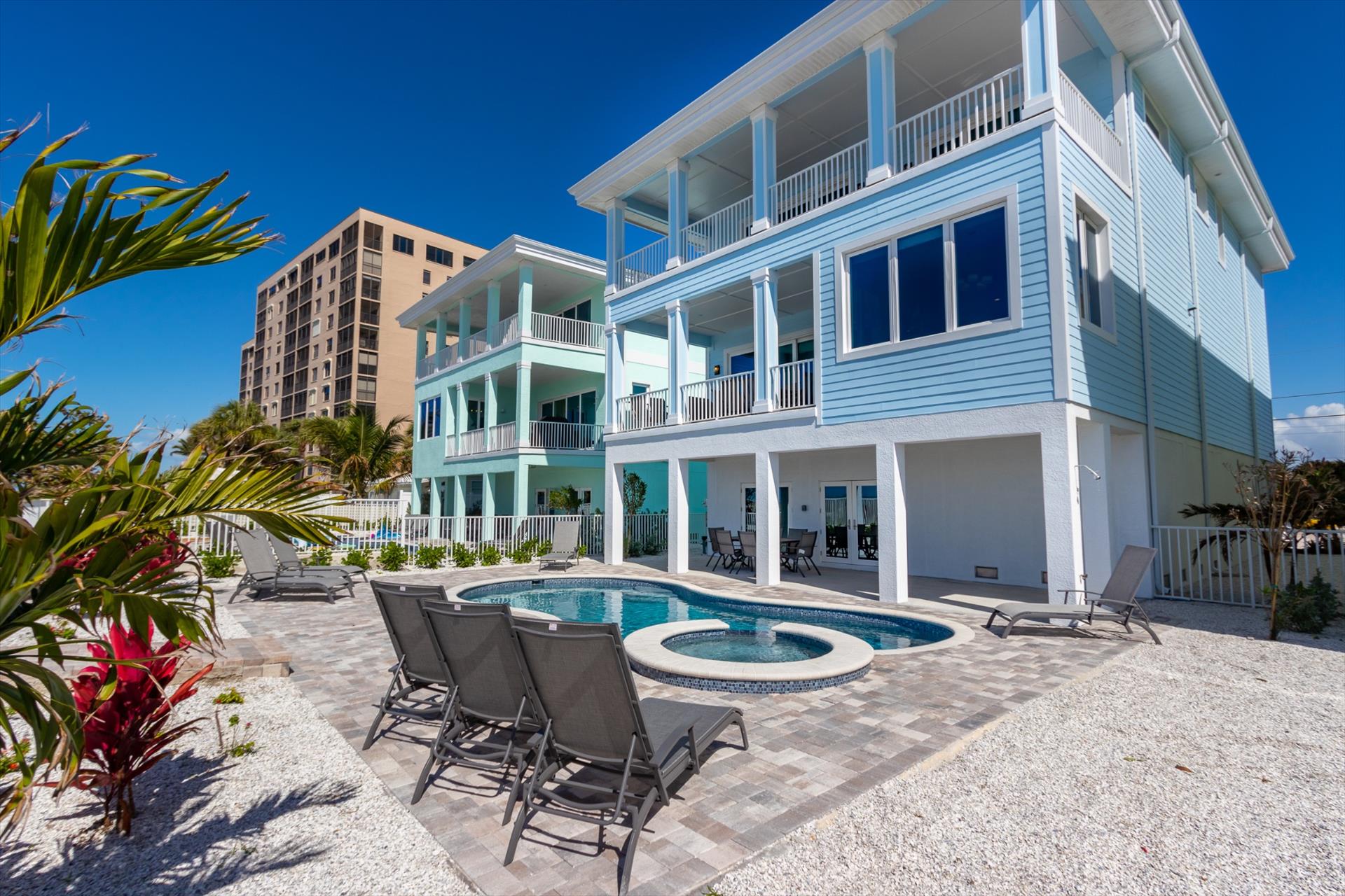 The rear of the property has a pool and hot tub, with sunbeds and seating for you and your party to relax in. There is also an outdoor shower for you to rinse off after a dip in the warm Gulf of Mexico which is just steps away. There are plenty of amenities and toys for your use. We have beach chairs and umbrellas, Paddle boards and Kayaks available for your use*. There is also a full crib, pack-n-play, high chair and baby gates for your convenience. There is no doubt, that you, your family and friends will enjoy your stay in our home.