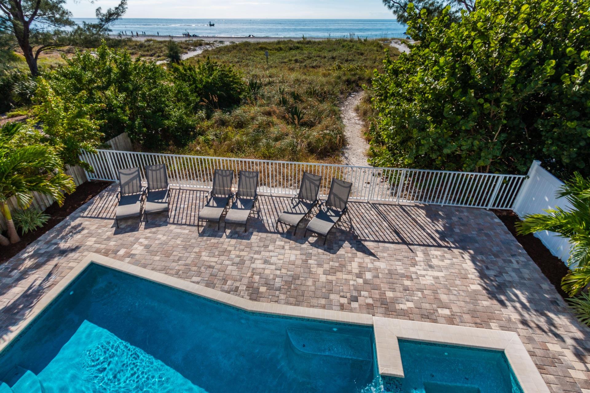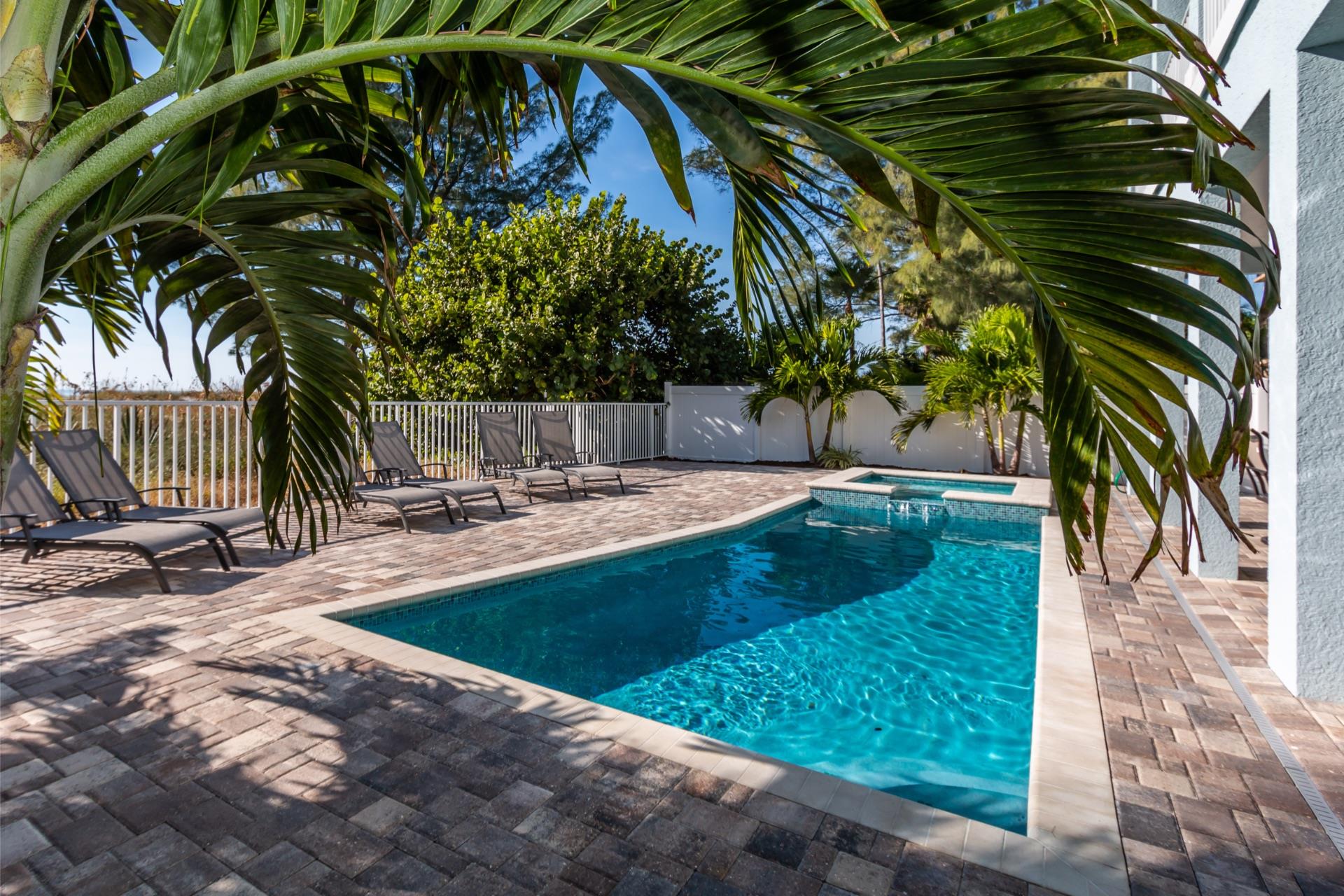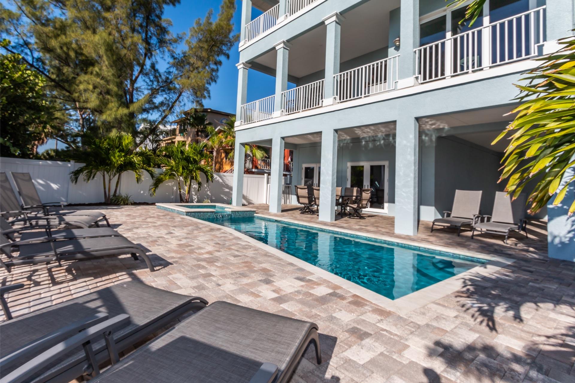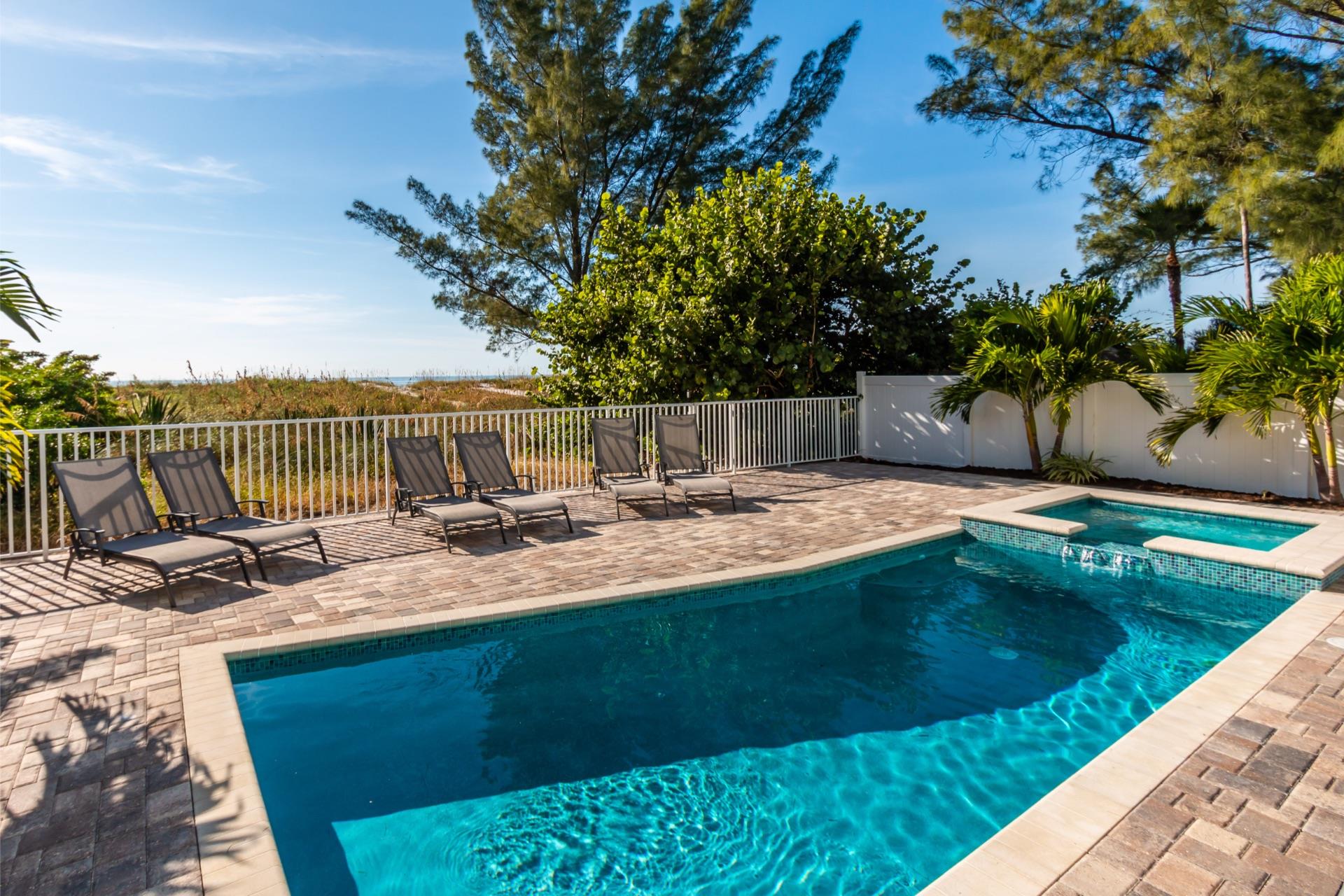 The rear of the property has a pool and hot tub, with sunbeds and seating for you and your party to relax in. There is also an outdoor shower for you to rinse off after a dip in the warm Gulf of Mexico which is just steps away. There are plenty of amenities and toys for your use. We have beach chairs and umbrellas, Paddle boards and Kayaks available for your use*. There is also a full crib, pack-n-play, high chair and baby gates for your convenience.