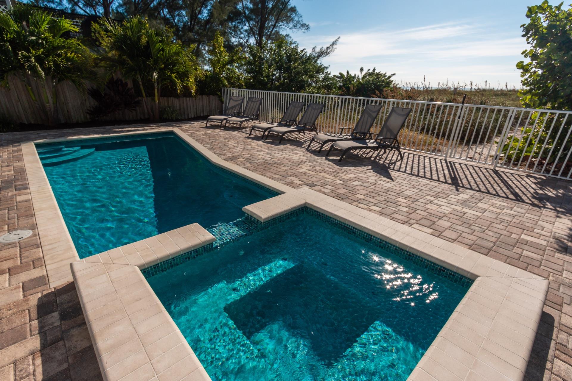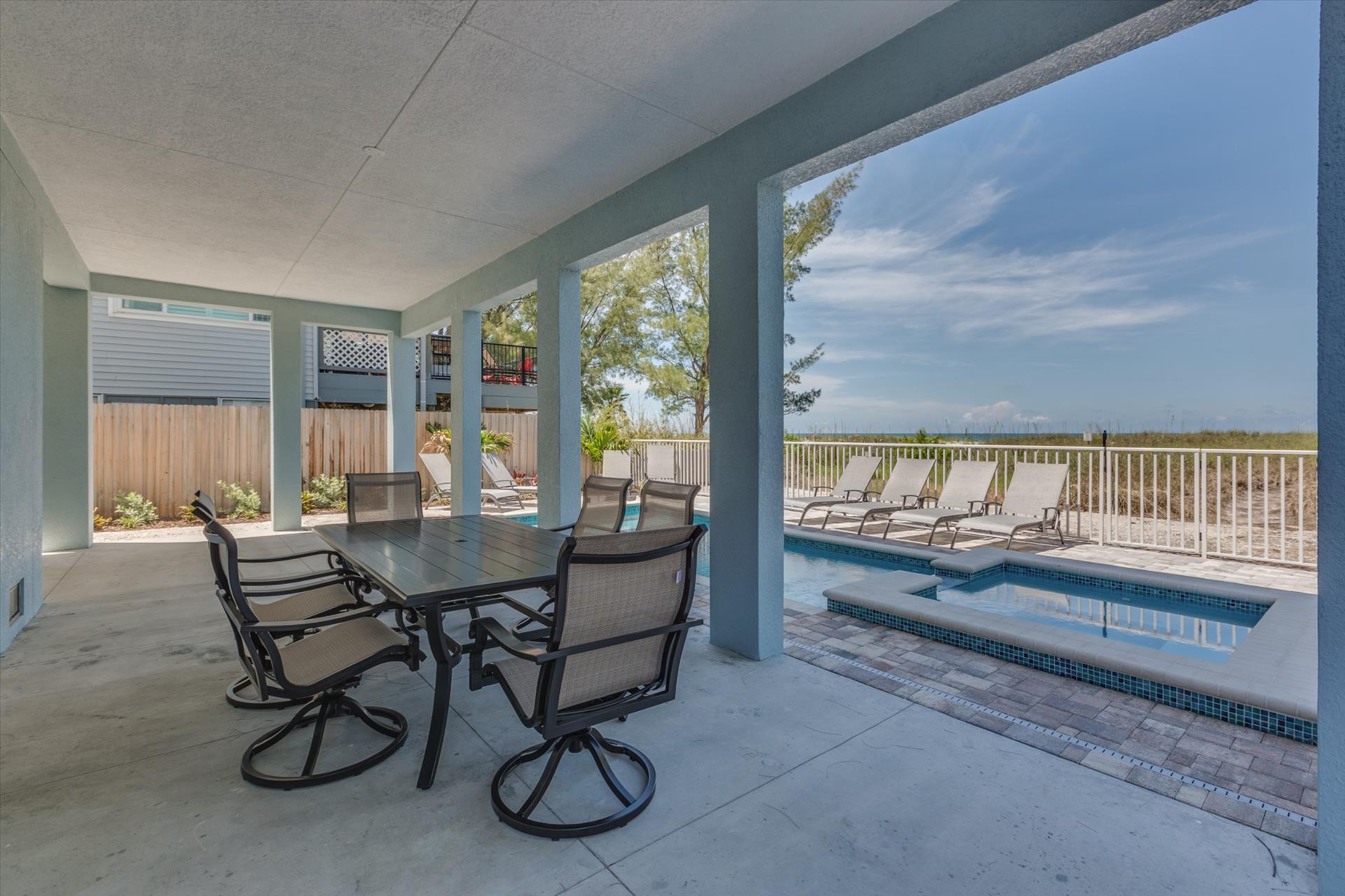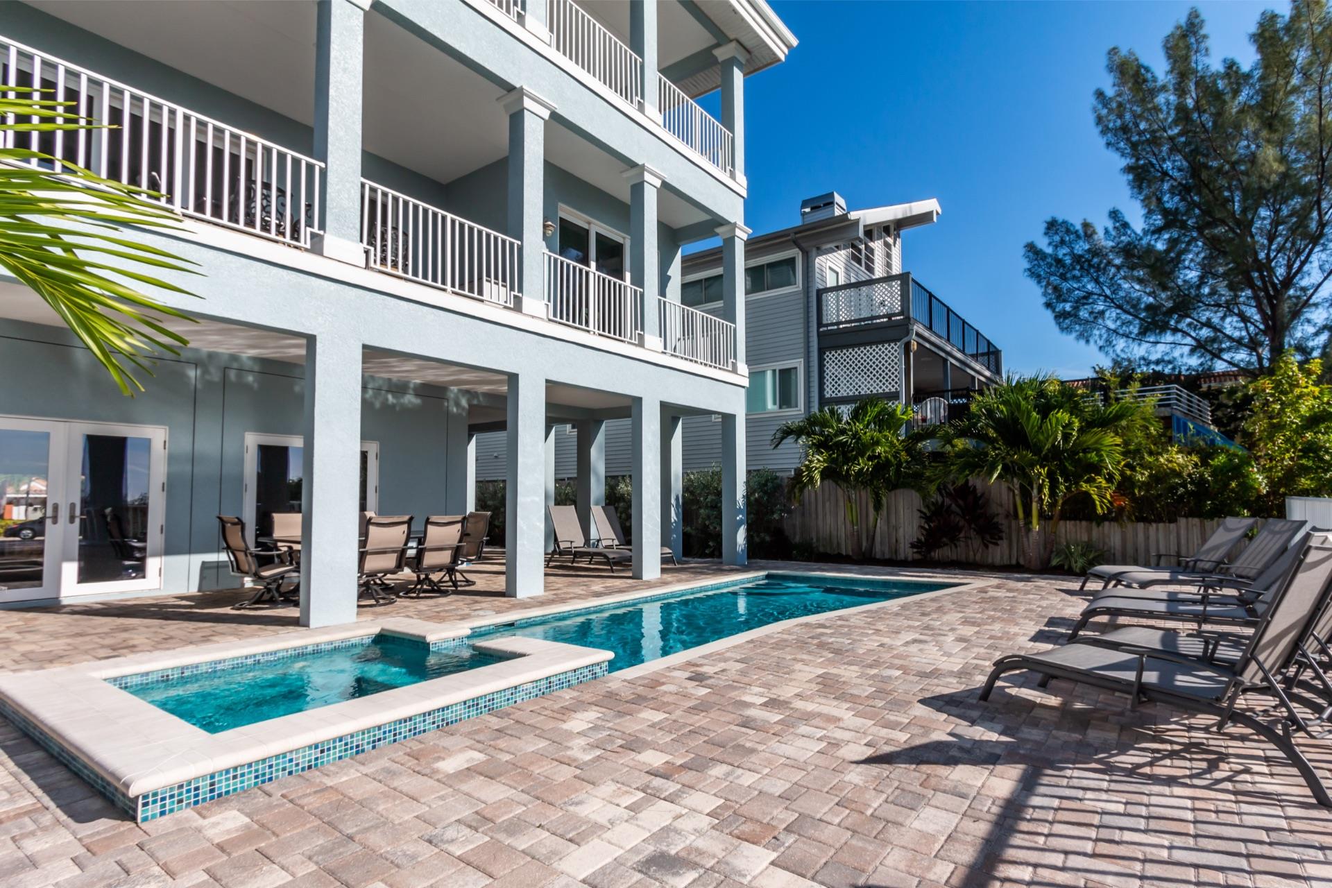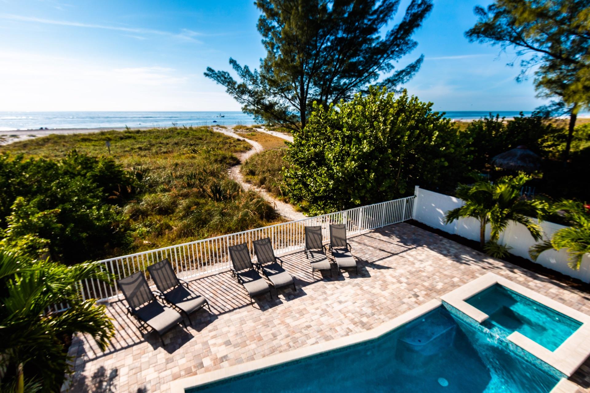 The rear of the property has a pool and hot tub, with sunbeds and seating for you and your party to relax in. There is also an outdoor shower for you to rinse off after a dip in the warm Gulf of Mexico which is just steps away. There are plenty of amenities and toys for your use. We have beach chairs and umbrellas, Paddle boards and Kayaks available for your use*. There is also a full crib, pack-n-play, high chair and baby gates for your convenience.