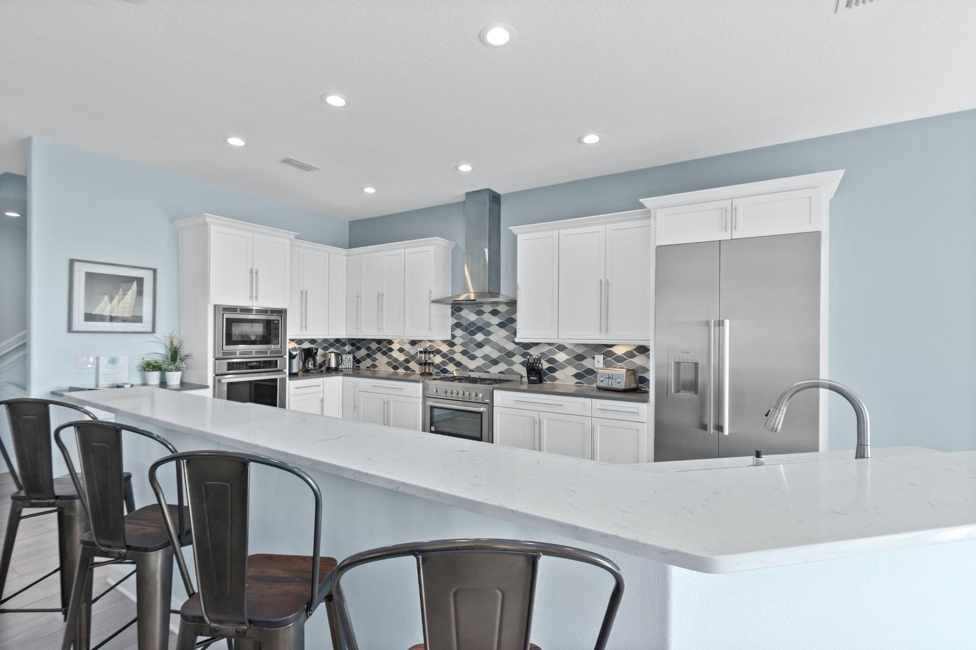 On the second floor you will walk into a large living area with flat screen TV. There is a fantastic kitchen featuring a gas hob and stove, electric combo oven/microwave, refrigerator and dishwasher with seating for 6 at the island. There is also a wet bar and breakfast nook together with a formal dining area. You can step out onto the balcony to BBQ or sit out and enjoy the breathtaking views.