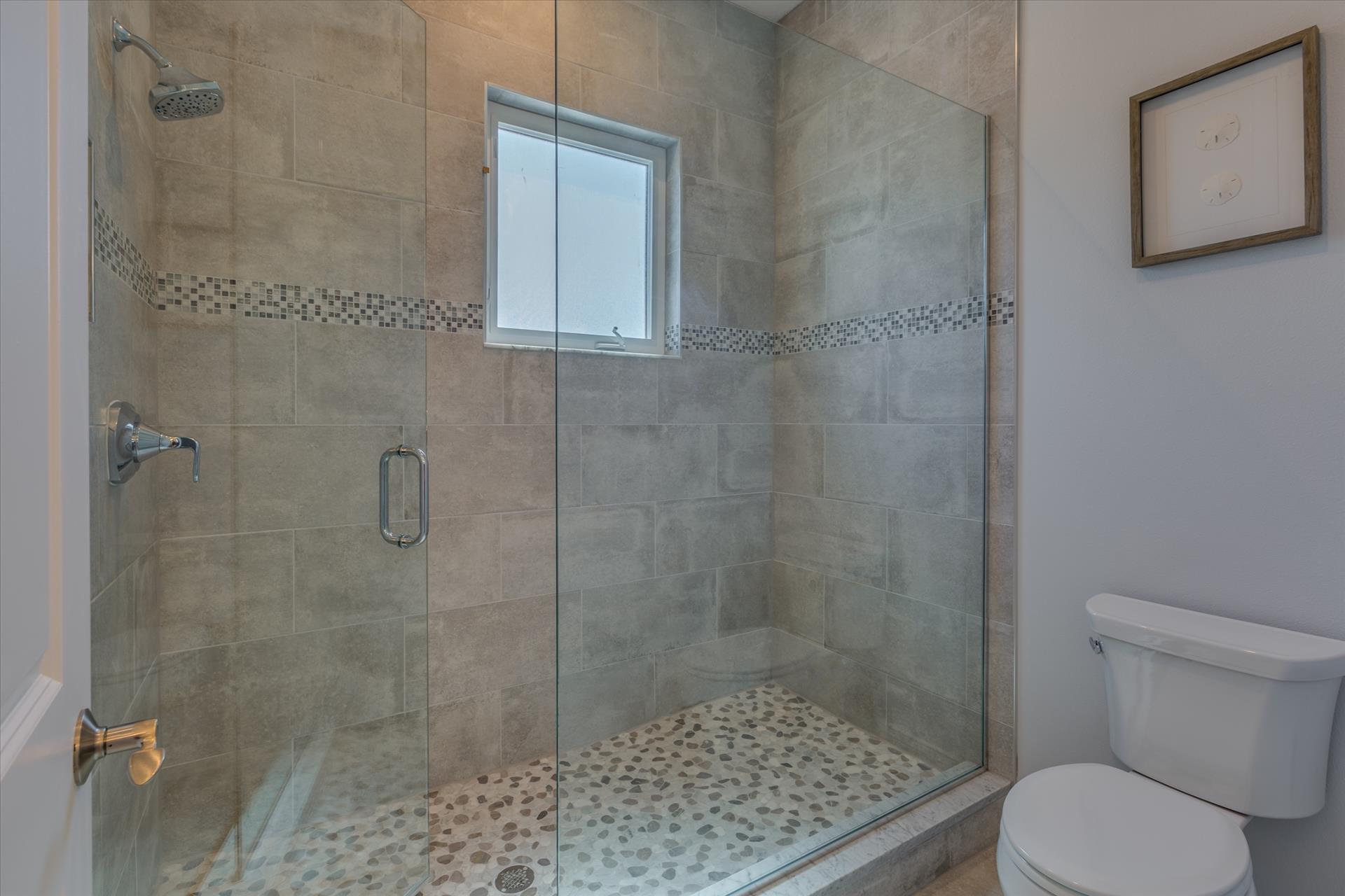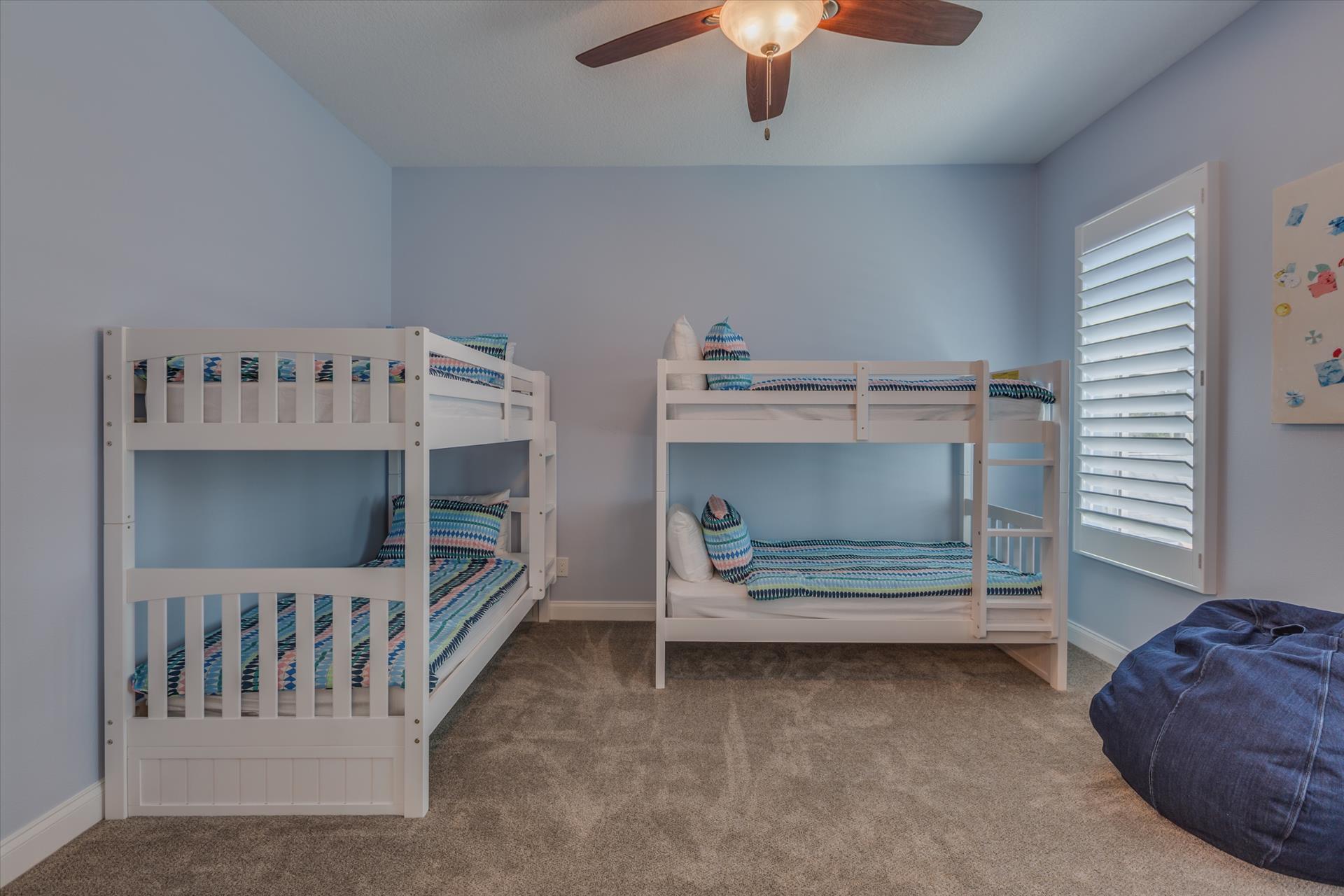 On this level there are two bedrooms, one with a king bed, the other with two sets of bunk beds. These bedrooms share a Jack'n'Jill bathroom with shower. There is also a half bathroom for guests to use off of the living area.