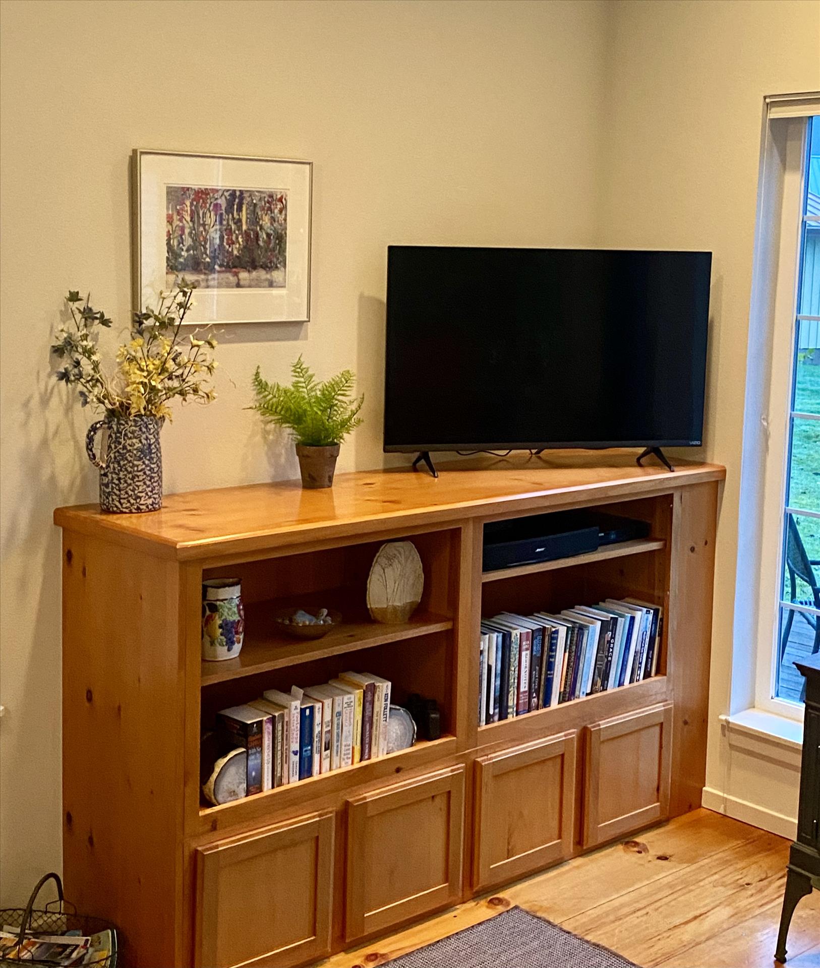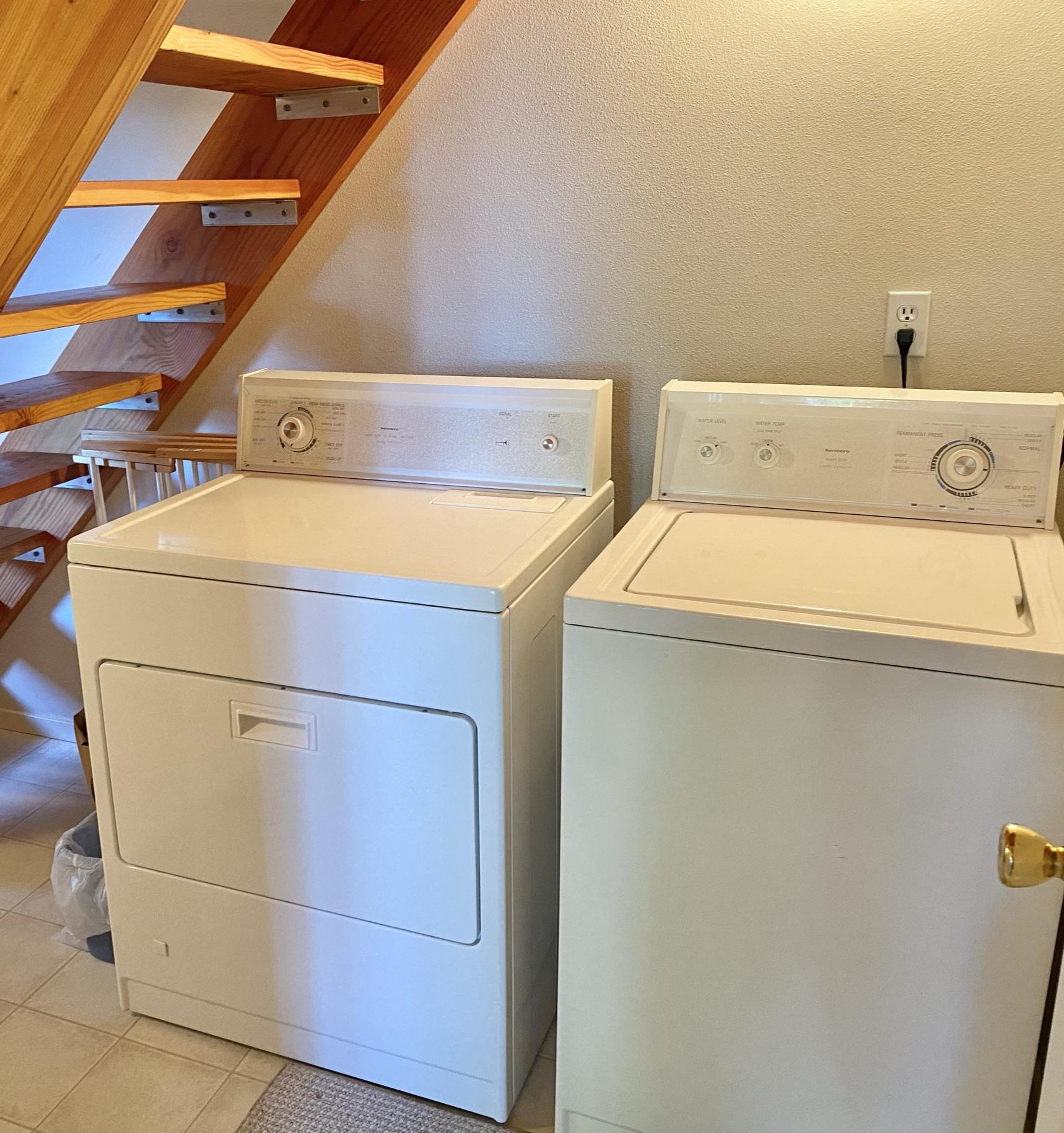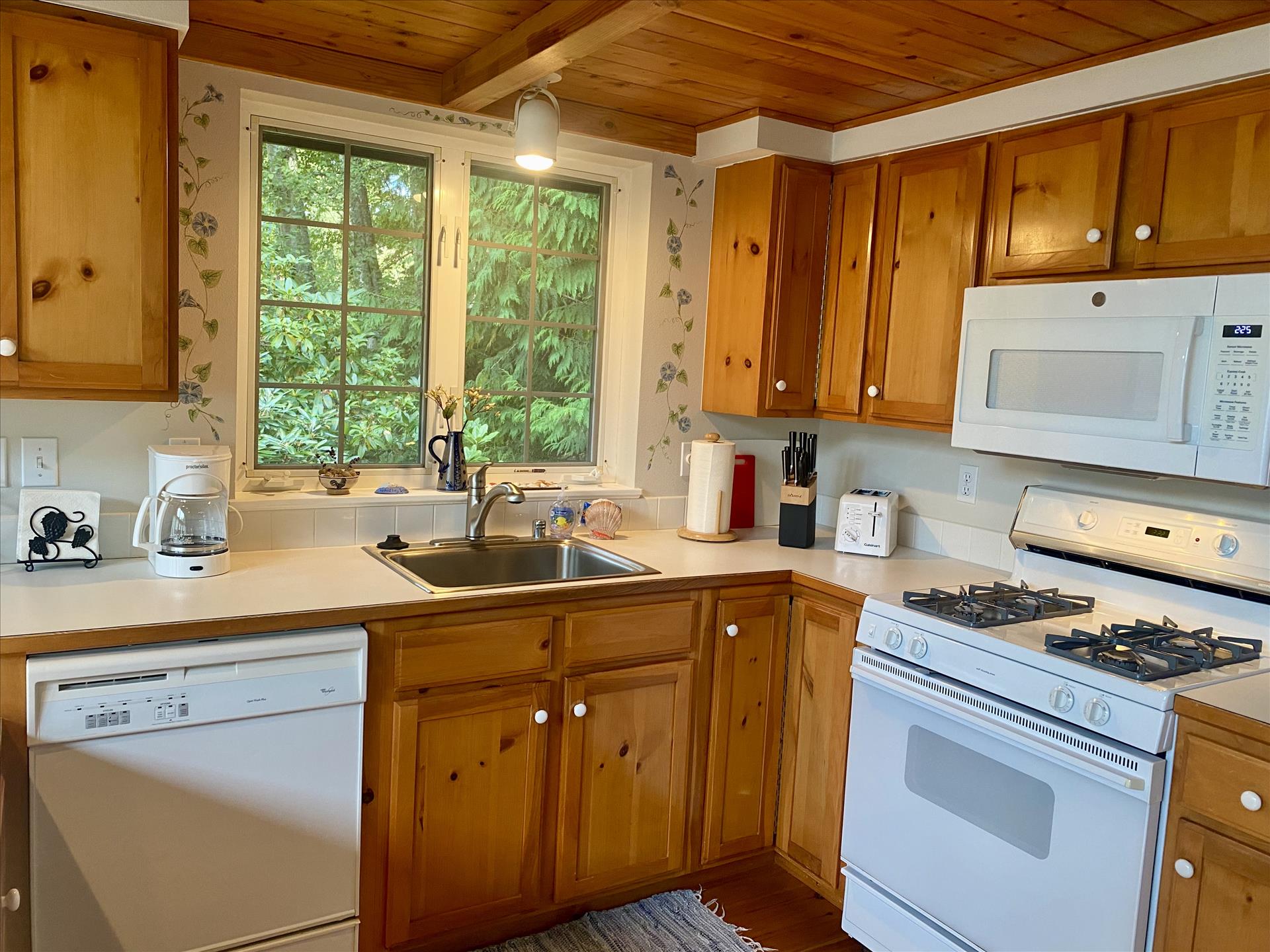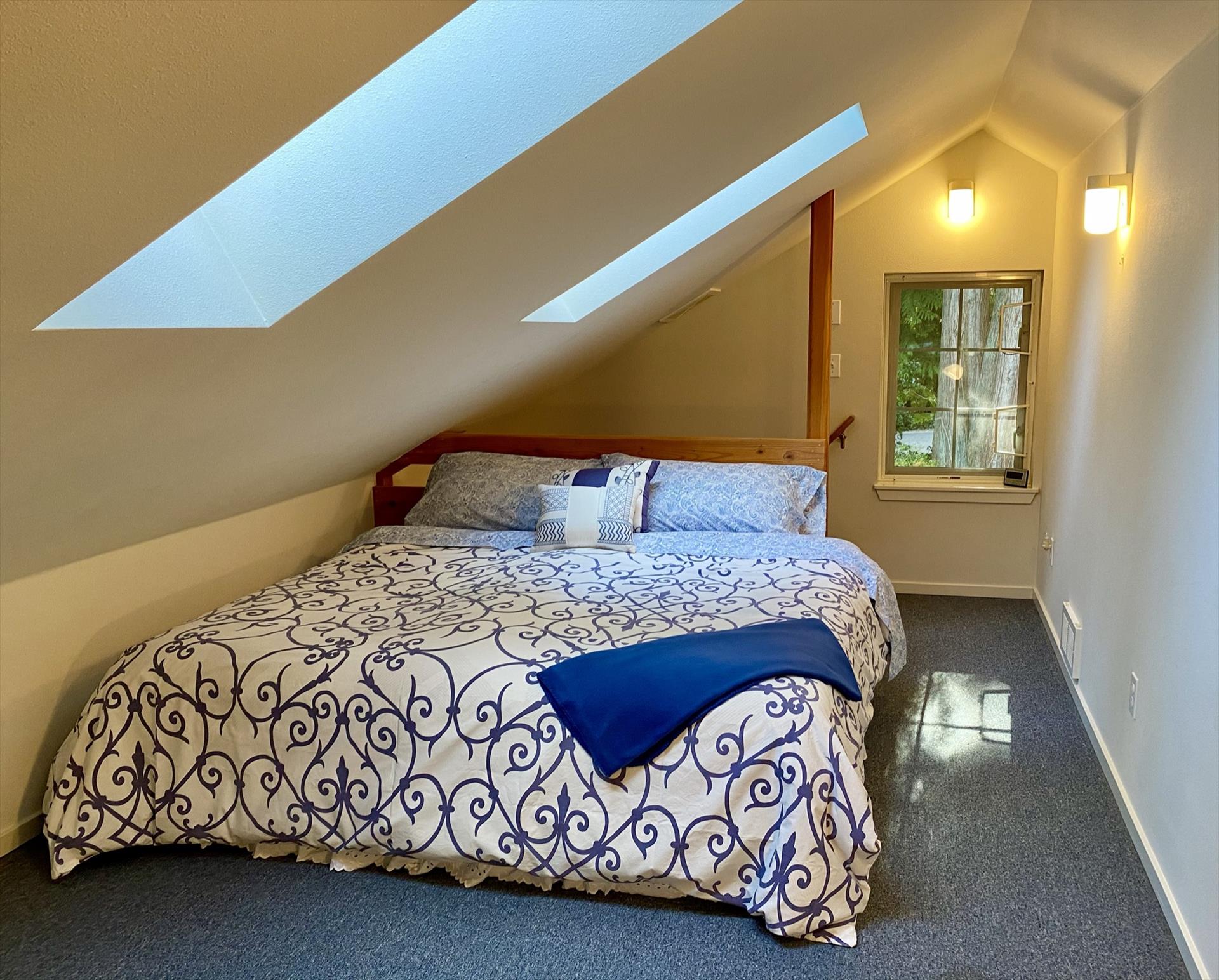 There is one bedroom on the main level with a king-size pillow top bed, ceiling fan and skylight. The second bedroom is an upstairs open area loft, which overlooks the living room. There is a king-size bed in the loft with double skylights that lead to views of the stars & towering cedars above. The bathroom has double sinks and a separate shower/toilet area.  There is a full size washer & dryer in the utility room. Other amenities include internet, wifi, dvd player, cable tv, 47” Smart TV & built in microwave.