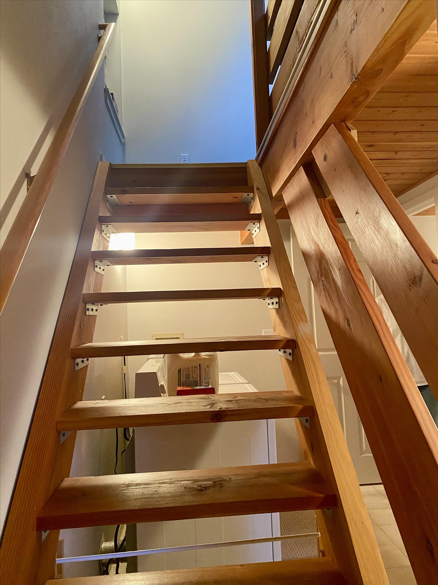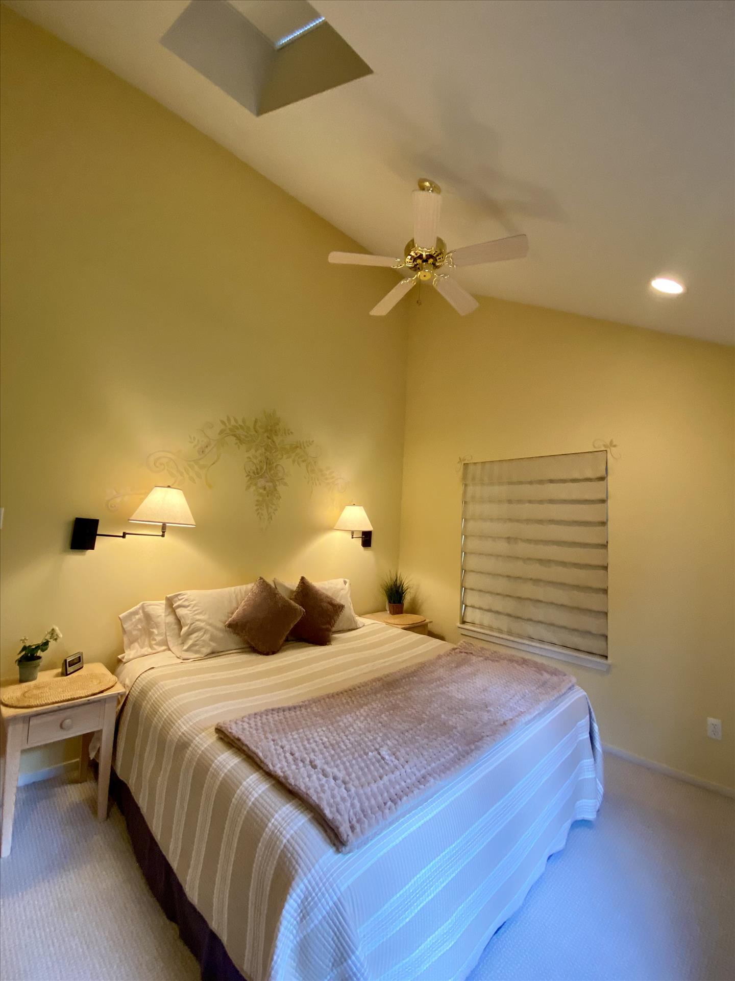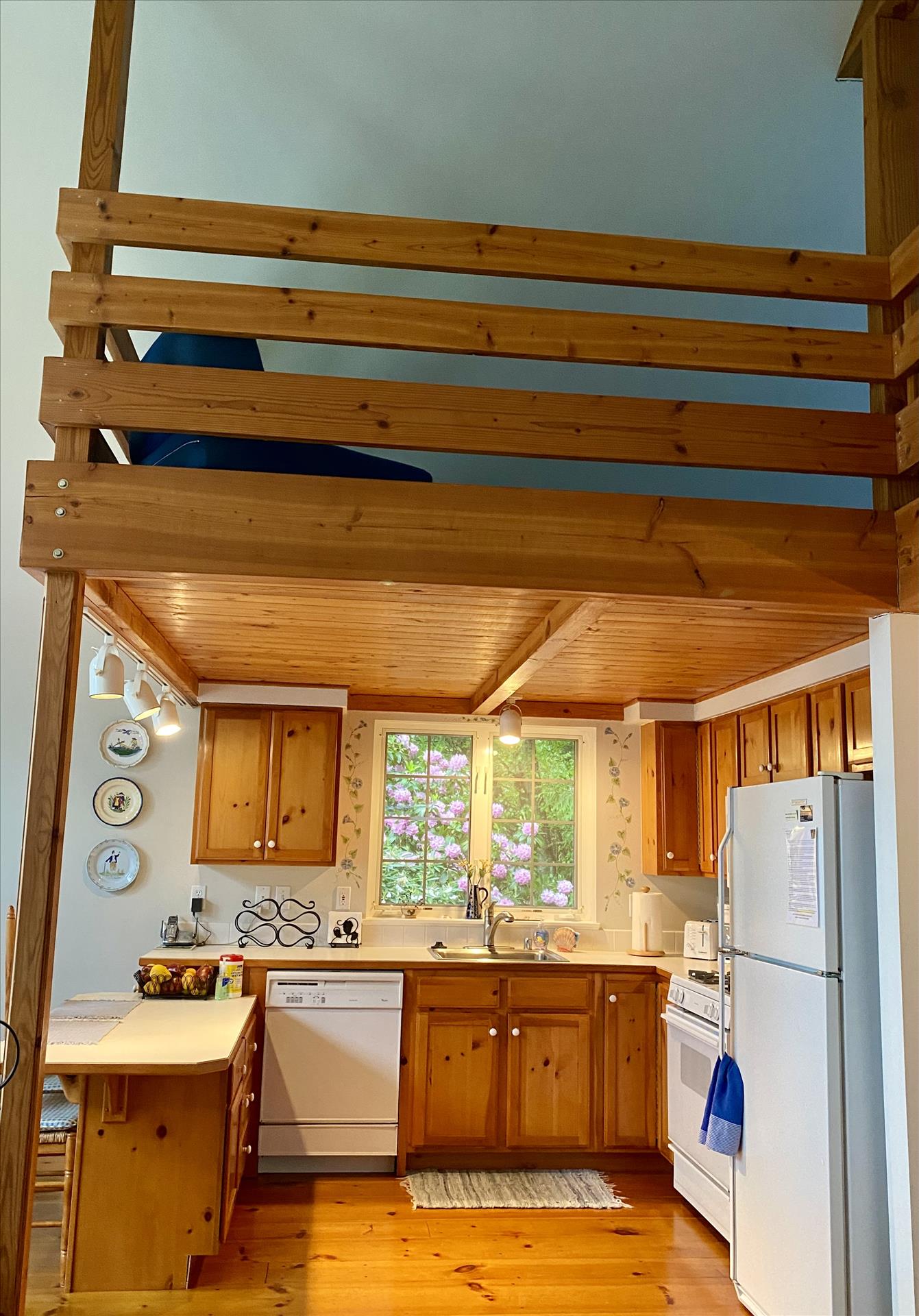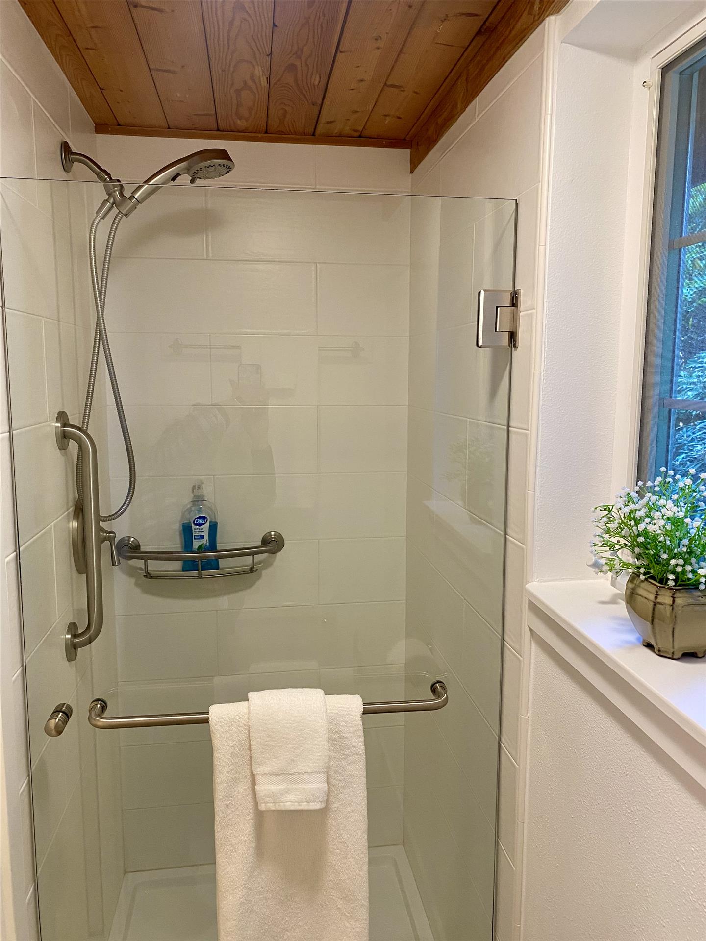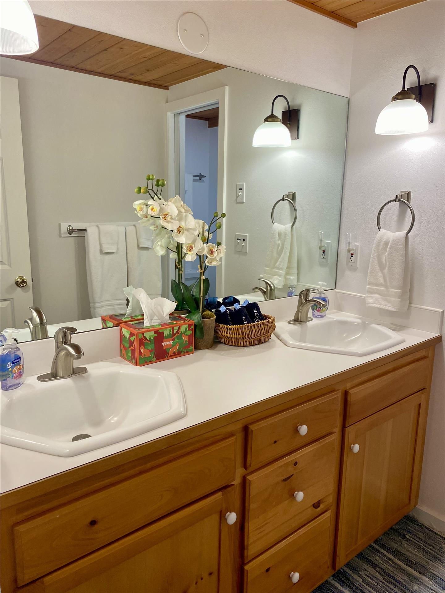 There is one bedroom on the main level with a king-size pillow top bed, ceiling fan and skylight. The second bedroom is an upstairs open area loft, which overlooks the living room. There is a king-size bed in the loft with double skylights that lead to views of the stars & towering cedars above. The bathroom has double sinks and a separate shower/toilet area.  There is a full size washer & dryer in the utility room. Other amenities include internet, wifi, dvd player, cable tv, 47” Smart TV & built in microwave.