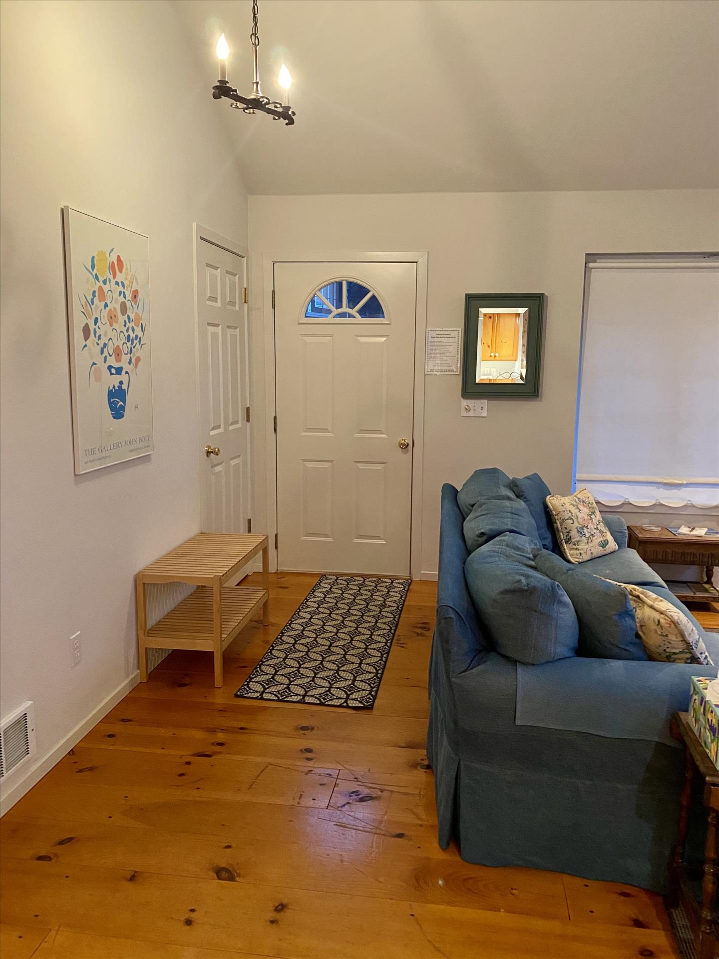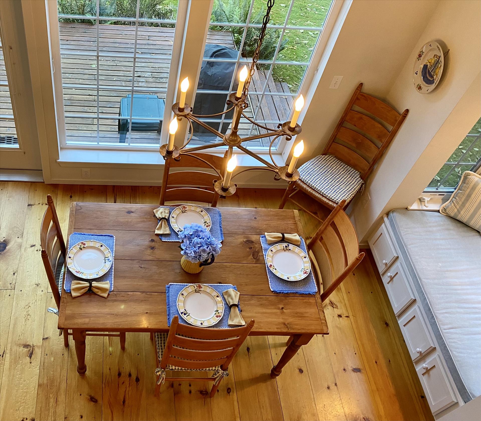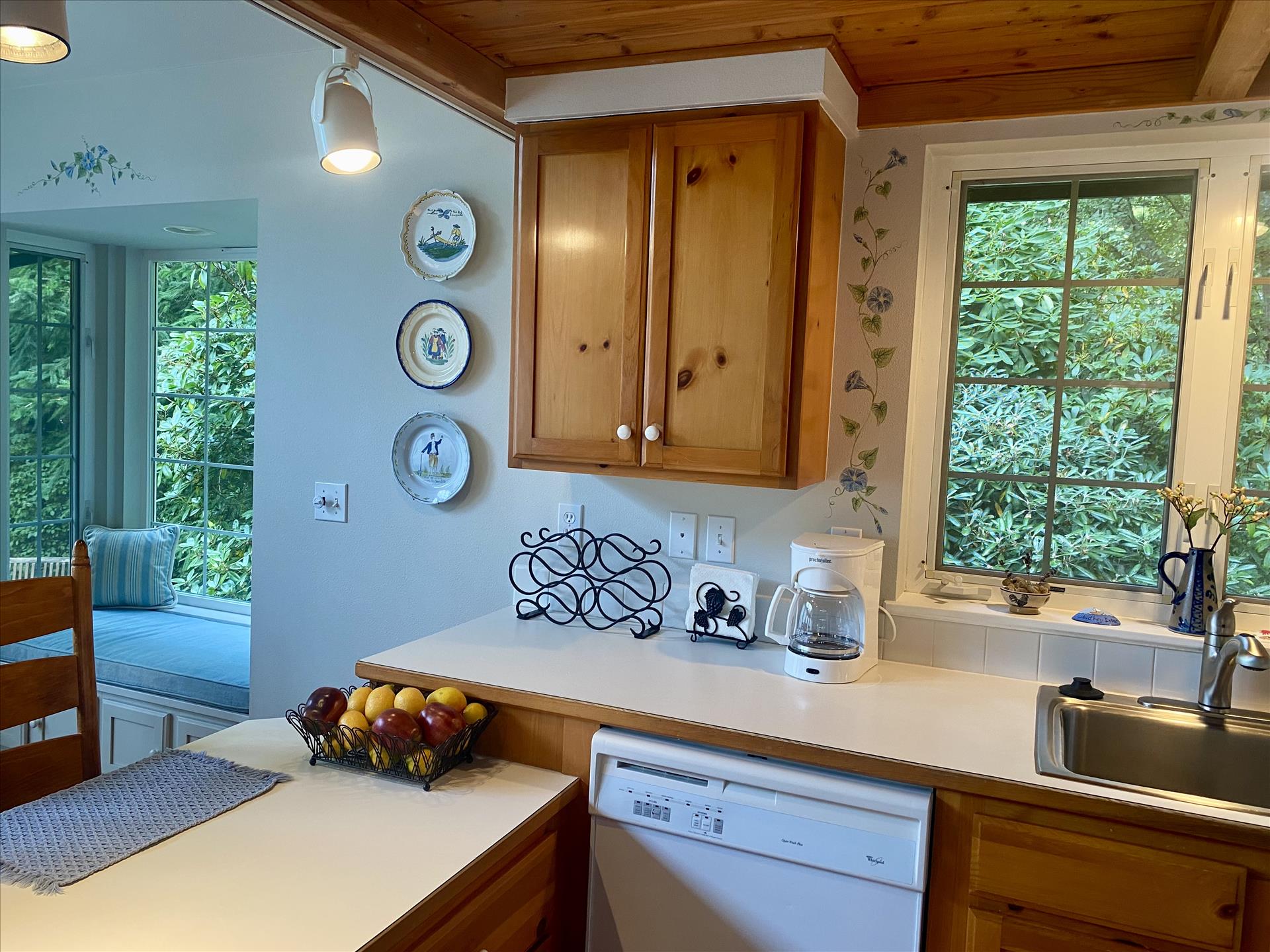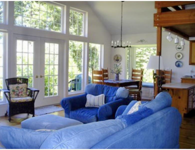 The cottage is decorated in cheery colors reminiscent of a French country cottage, complete with hand painted décor. The pine plank floors from New Hampshire add charm & warmth. Views of passing boats and whales can be glimpsed from the living room and deck or often some of the local deer, as there is an abundance of wildlife!