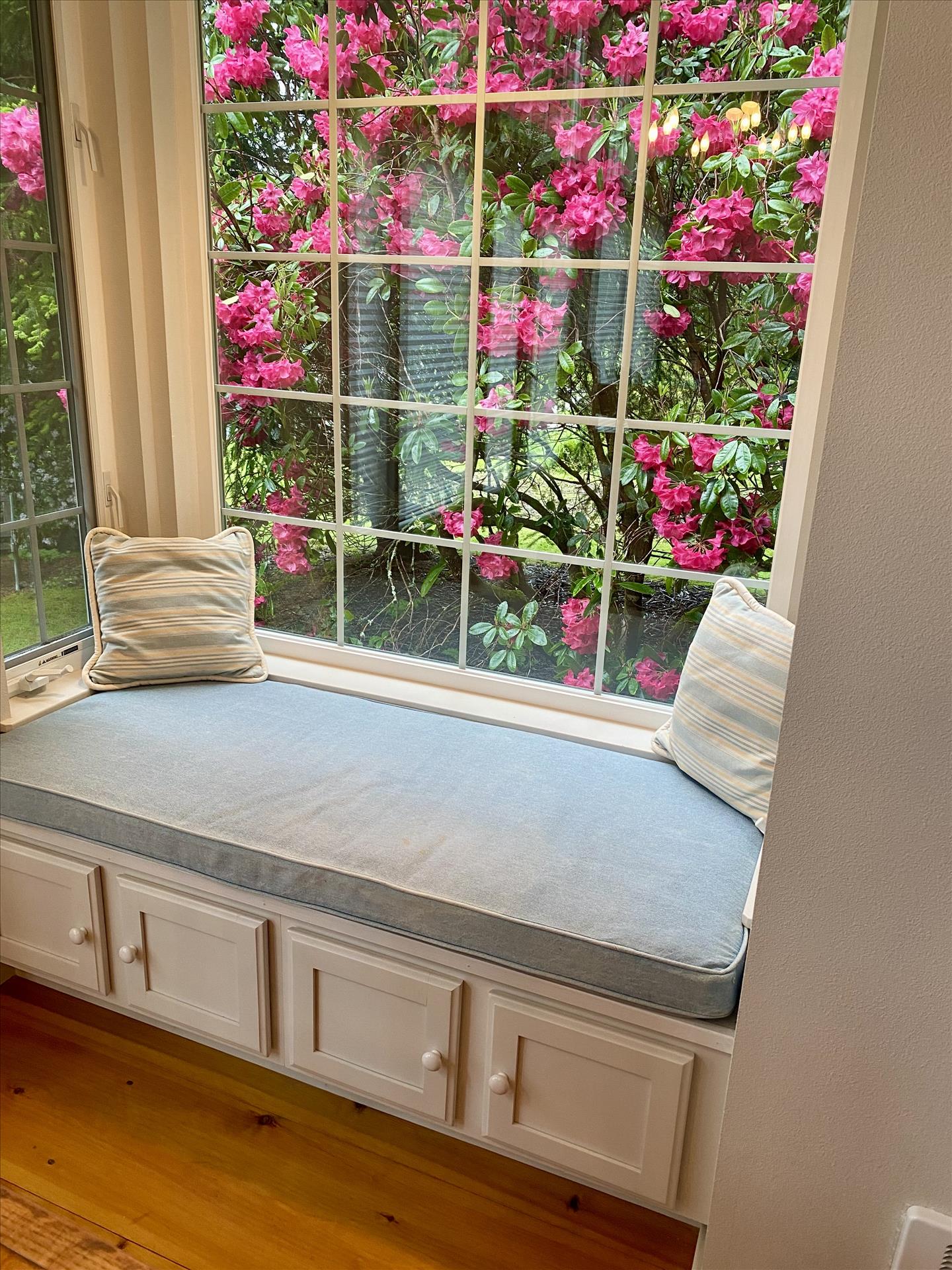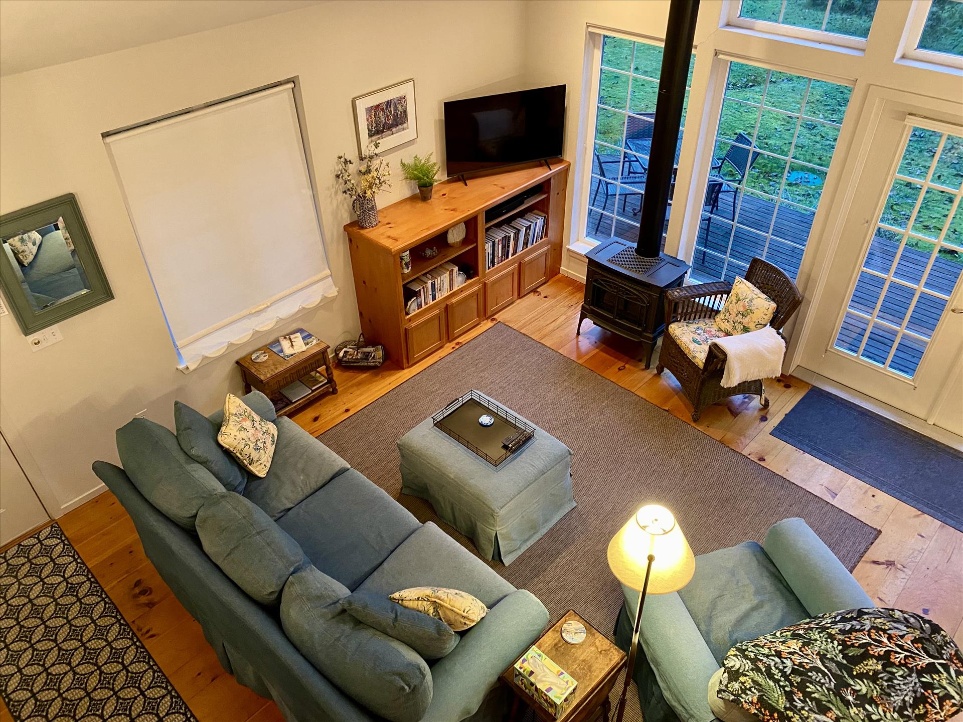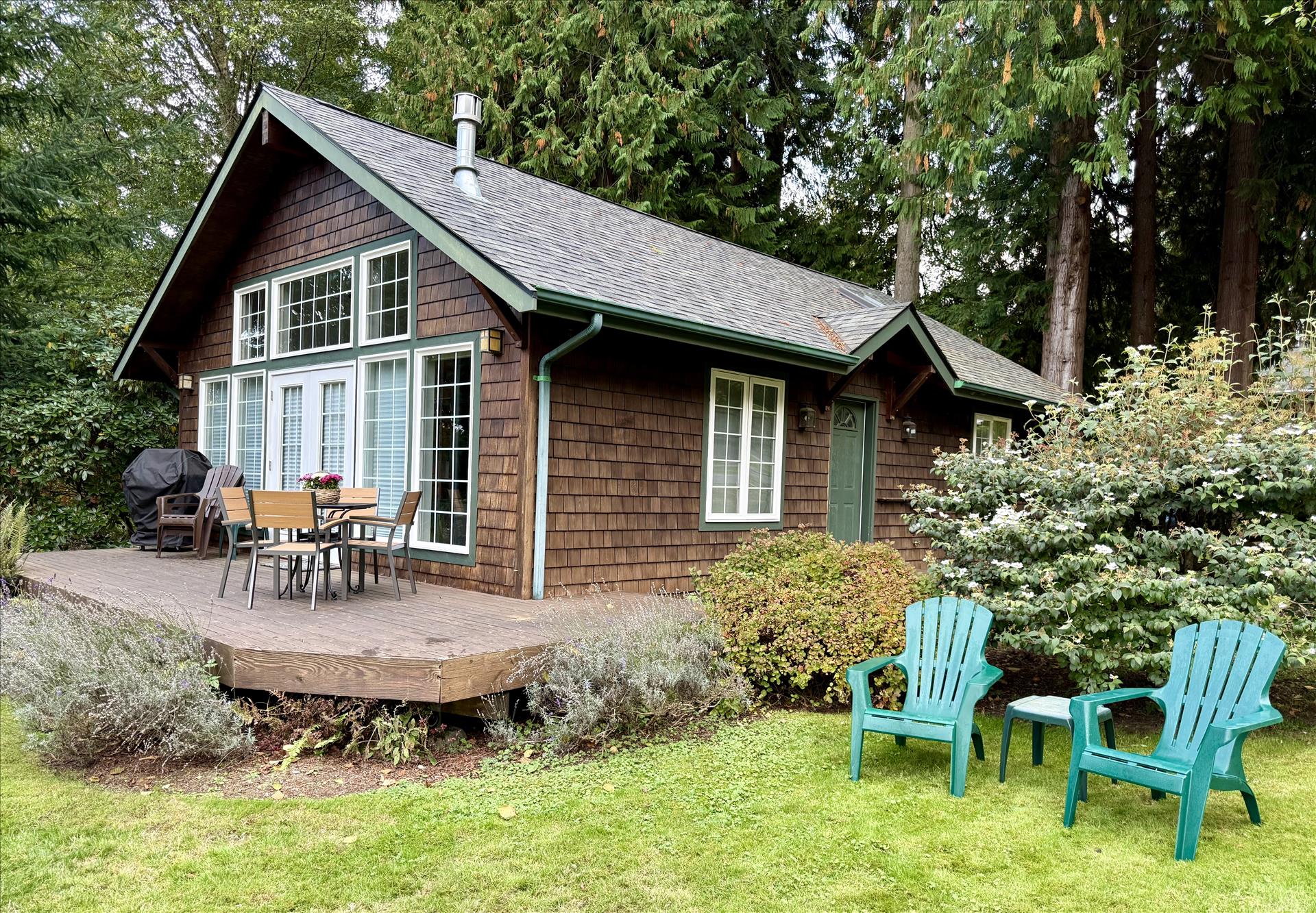 Sharon's Cottage is a privately owned, cozy, bright & cheery view property that is located about a half mile from the charming seaside village of downtown Langley.  The home has a floor to ceiling wall of north facing windows in the dining/living room area, which allows for good lighting, even on those northwest cloudy days. Double French doors lead to a spacious deck to enjoy your view & relax on.
