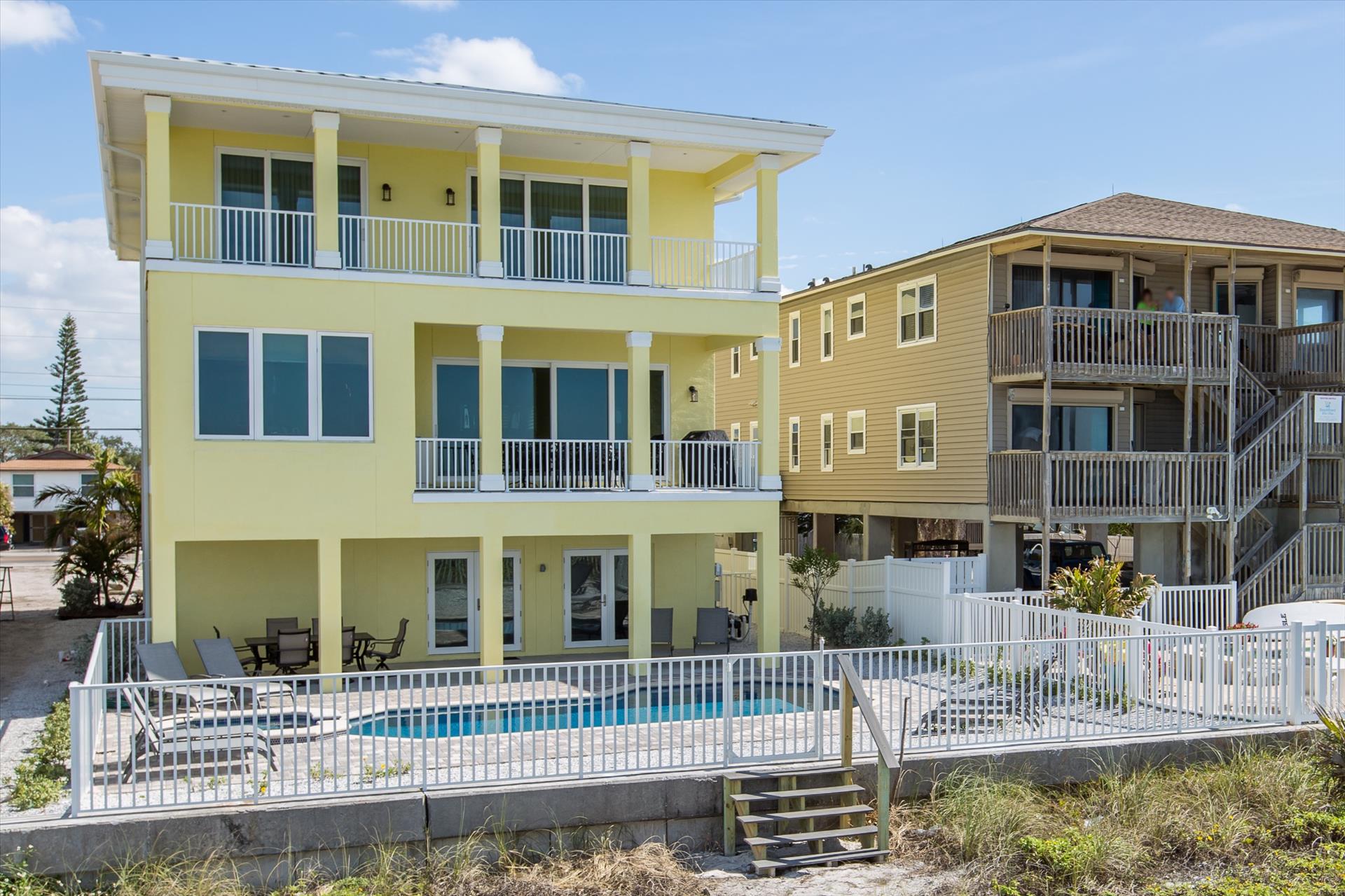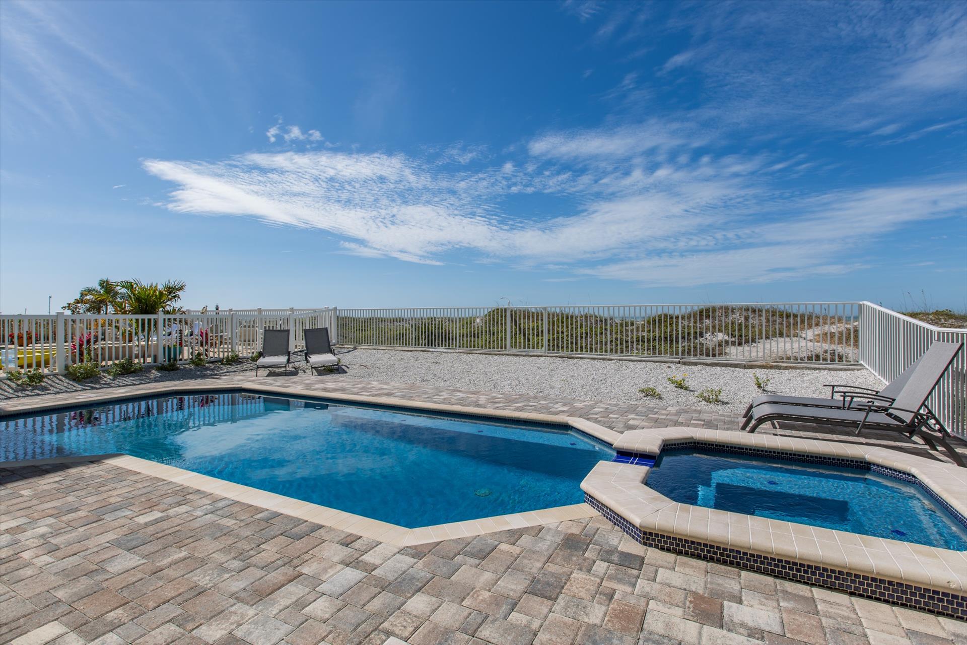 The rear of the property has a pool and hot tub, with sunbeds and seating for you and your party to relax in. There is also an outdoor shower for you to rinse off after a dip in the warm Gulf of Mexico which is just steps away. There are plenty of amenities and toys for your use. We have beach chairs and umbrellas, Paddle boards and Kayaks available for your use*. There is also a full crib, pack-n-play, high chair and baby gates for your convenience.