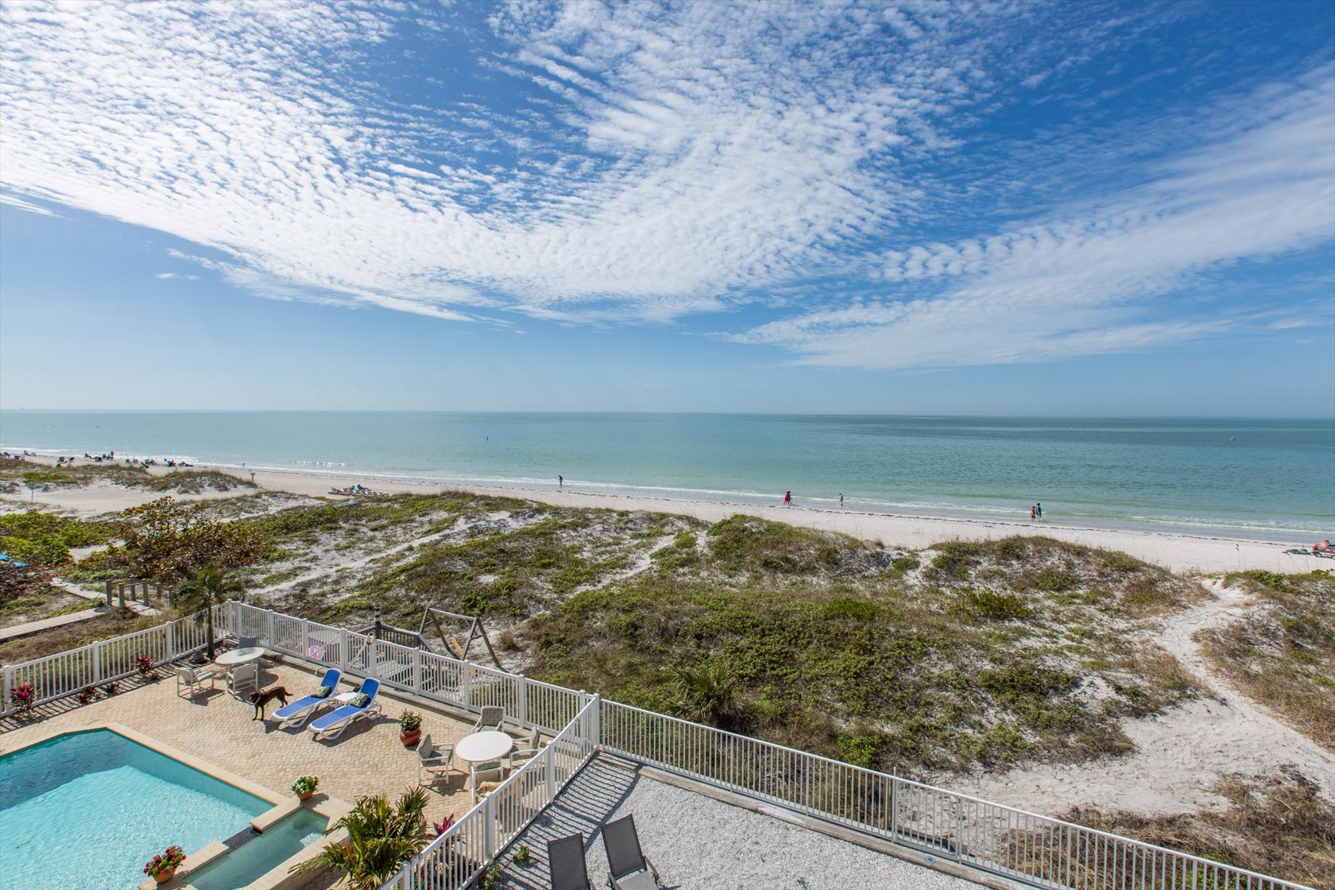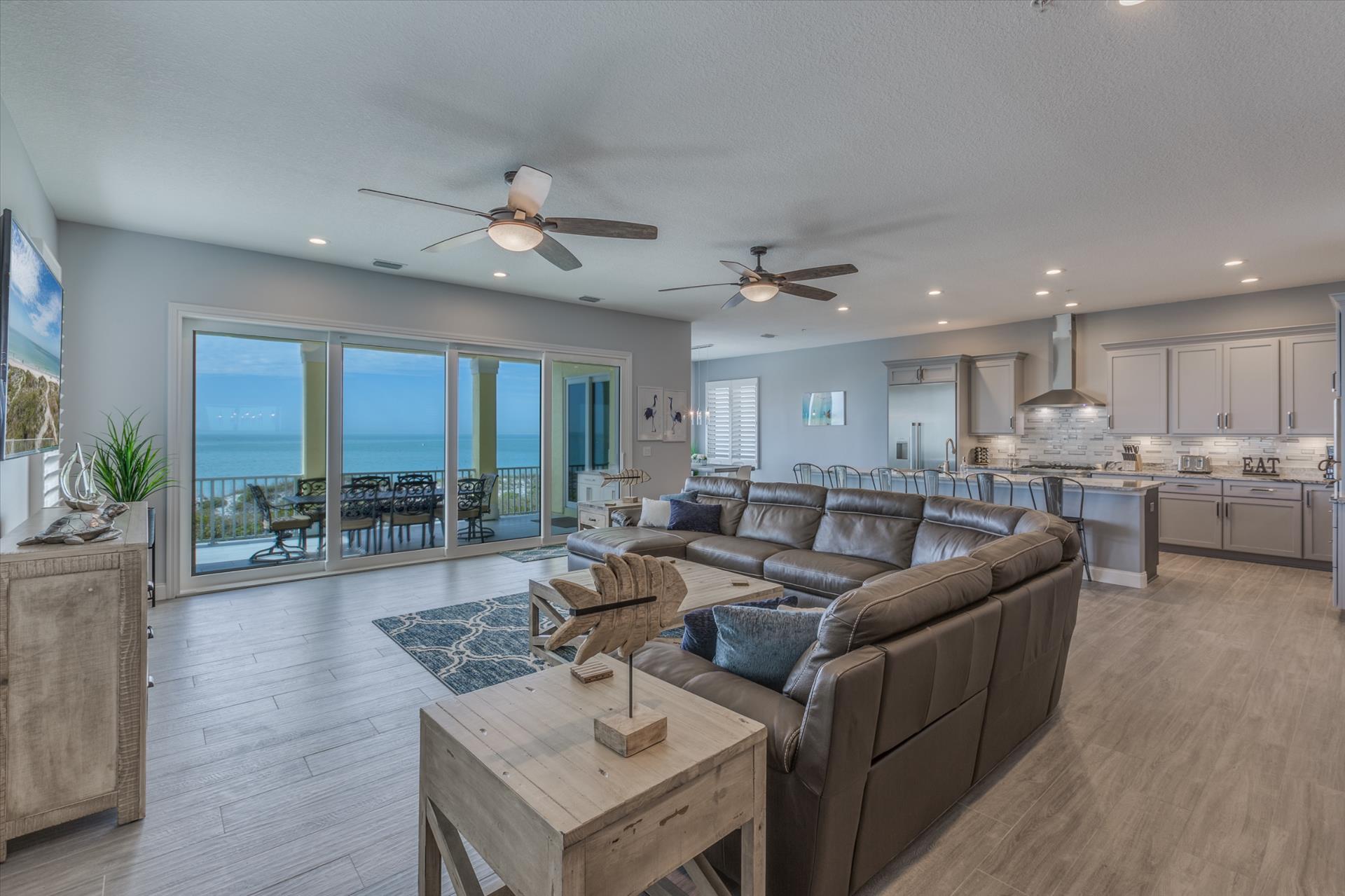 On the second floor you will walk into a large open living area with huge windows overlooking the beach. The living area also has a large sofa with flat screen TV. There is a fantastic kitchen featuring a gas hob and stove, electric combo oven/microwave, refrigerator and dishwasher with seating for 6 at the island. There is also a wet bar and breakfast nook together with a formal dining area. You can step out onto the balcony to BBQ or sit out and enjoy the breathtaking views.