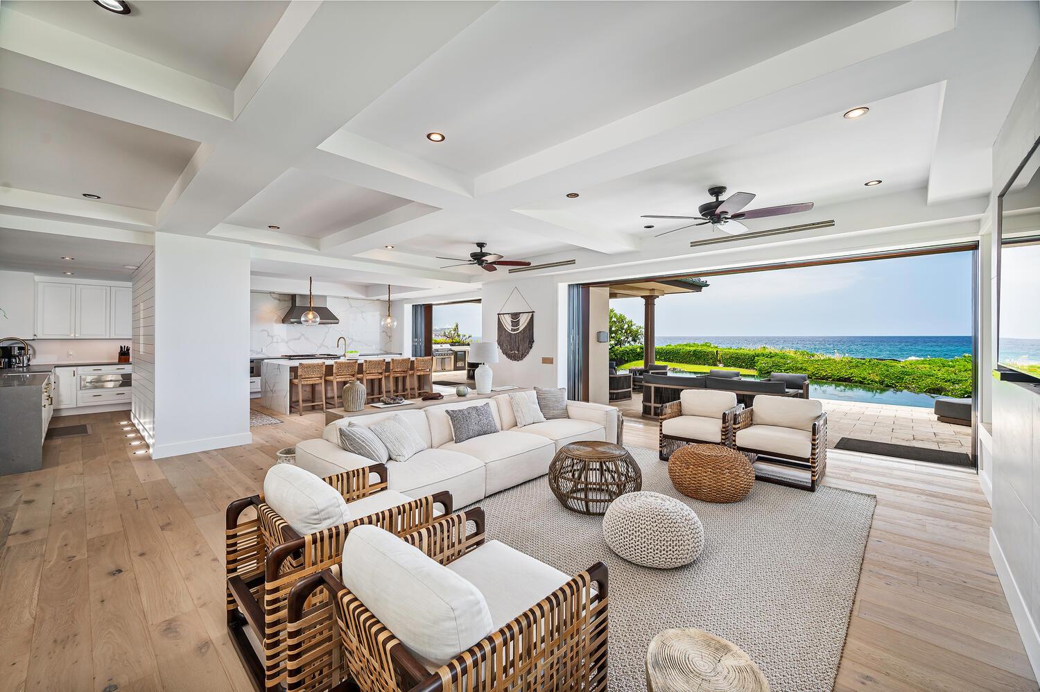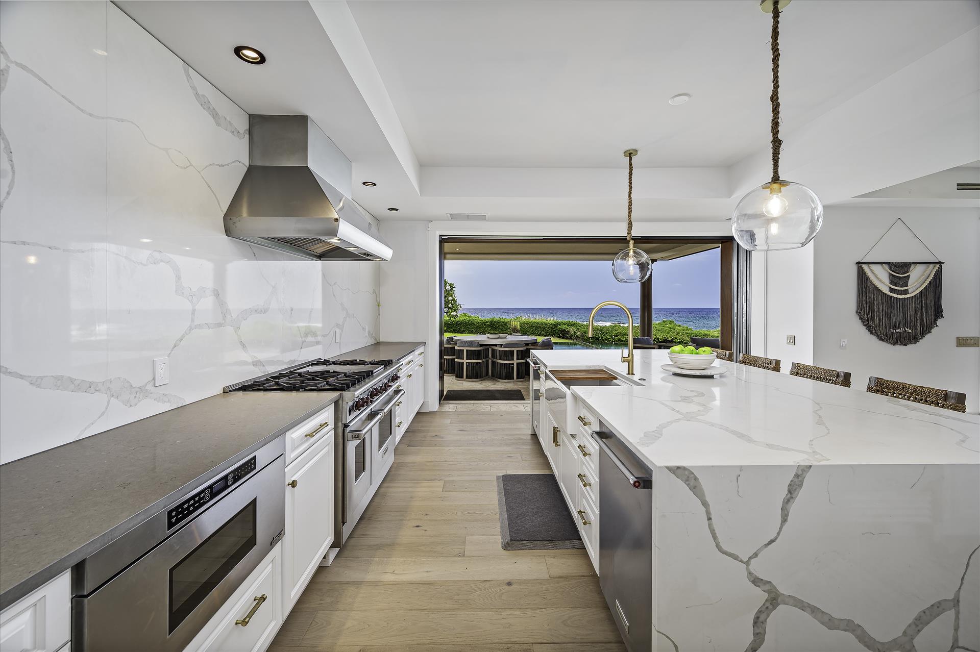Open concept living room with built in 80 inch TV, Restoration Hardware furniture from their Luxury Beach Edition... wide open kitchen with all high end quartz material and top of the line appliances from Wolf and Sub zero with huge entertaining island and perfectly complimented by Nautical designed rattan bar chairs and rope wrapped pendant lights. Detached pantry kitchen perfect for chefs.. amenities include Wolf six burner stove/plus griddle and two ovens; built-in drawer microwave, two dishwashers.