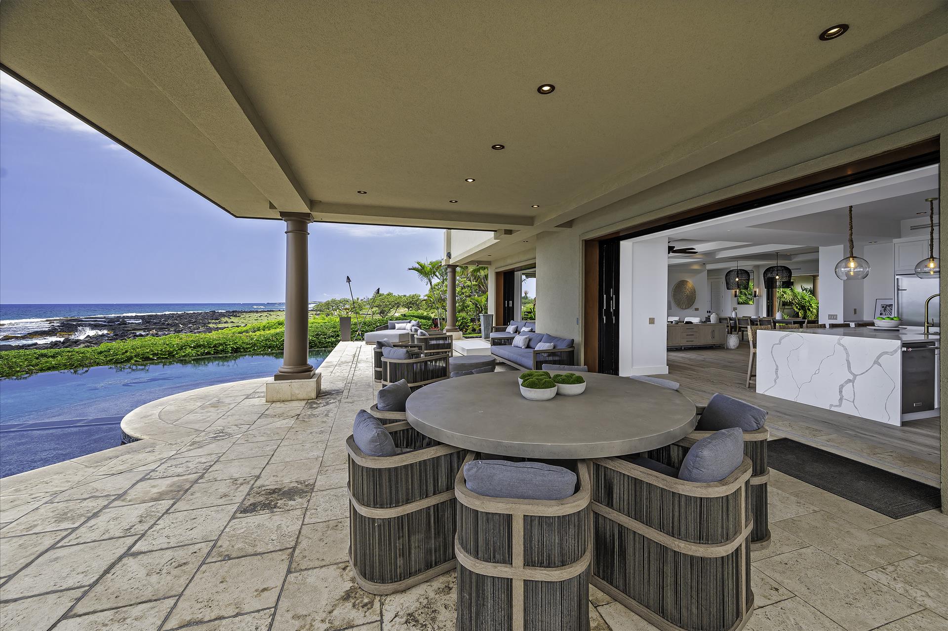 Enormous outdoor entertaining area with of course Restoration Hardware outdoor patio furniture, daybeds, concrete table and dining chairs all directed toward the Infinity Pool and Ocean right behind it....Outdoor area seemlessly connects to built in BBQ area with ice maker and new concrete BBQ top.
