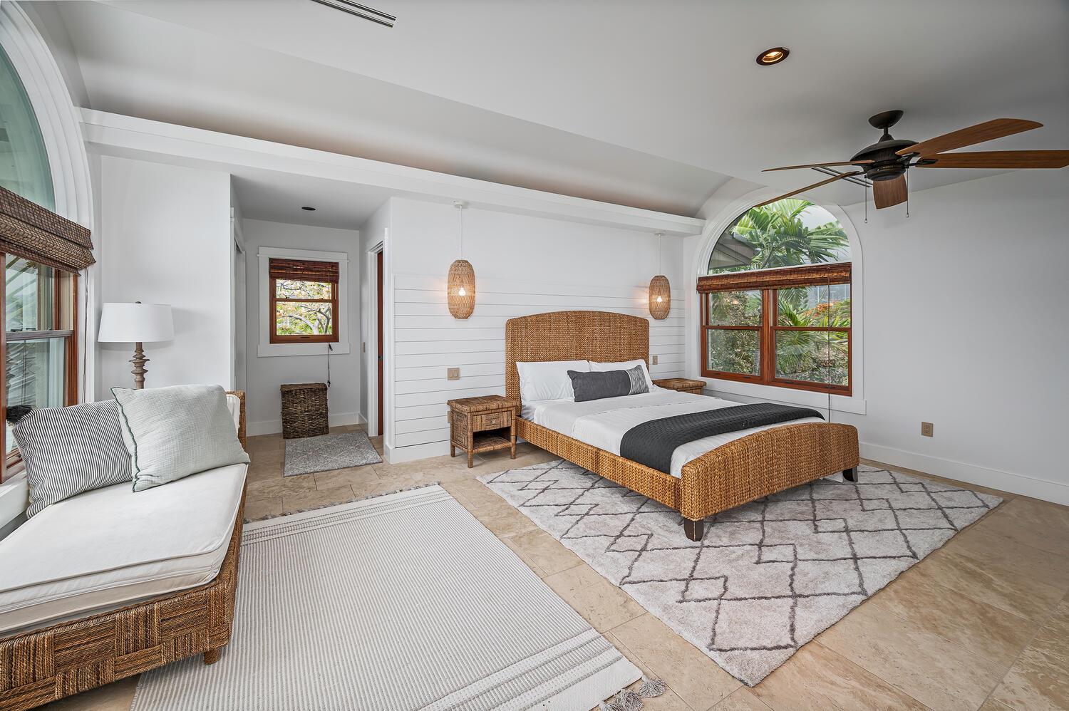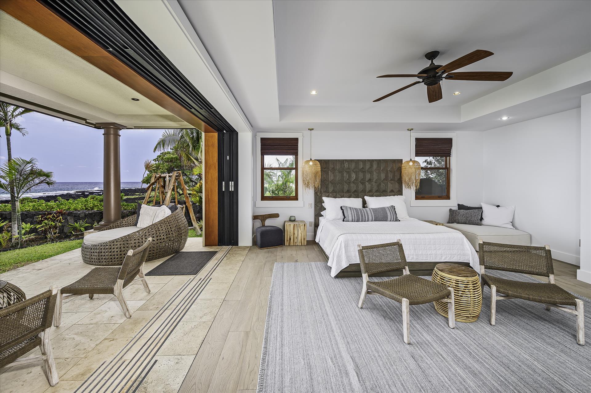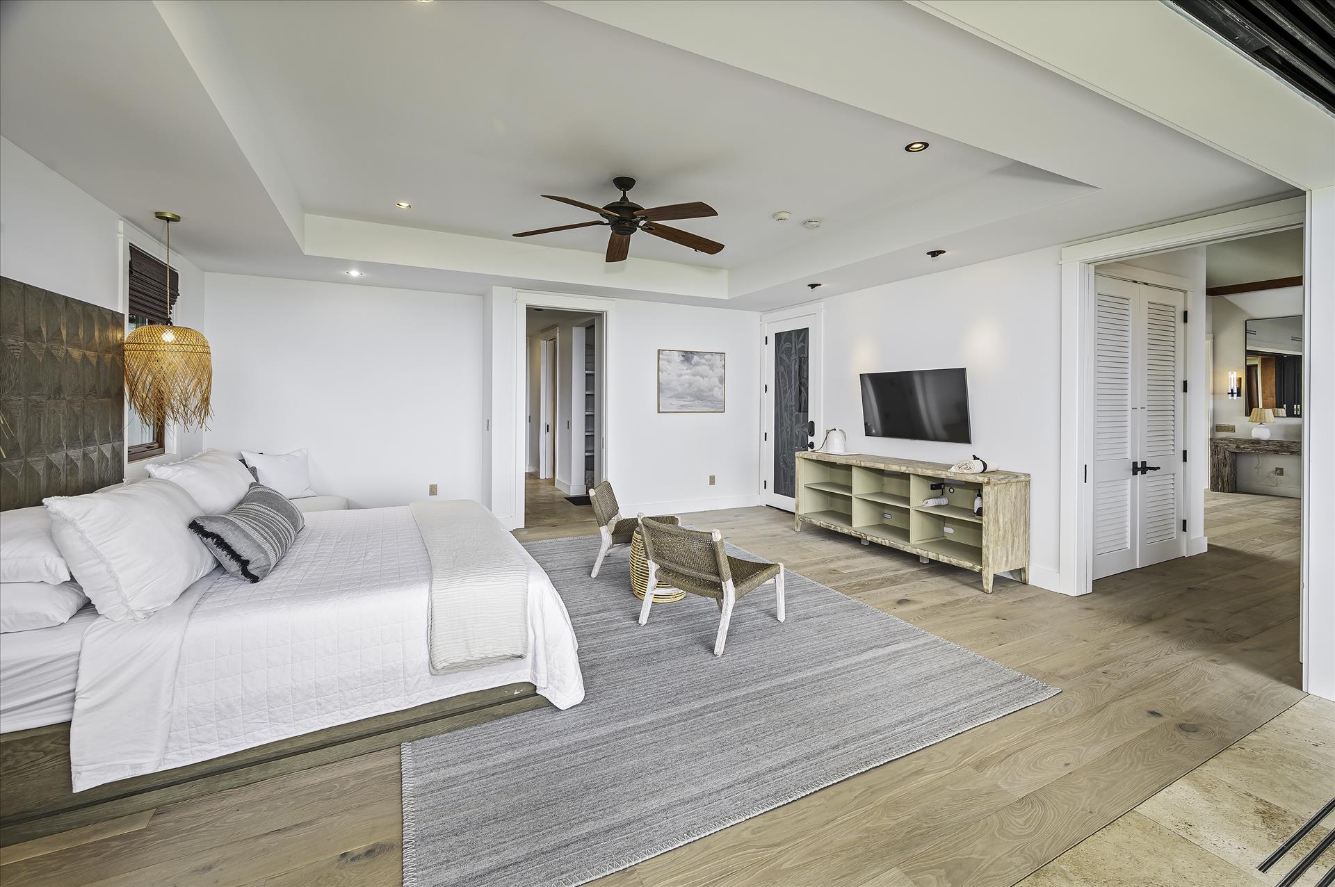Two sleeping ensuites are on the main level with full en-suite bathrooms. 1st Floor Master set next to manicured lawns and swaying palm trees with RH outdoor furniture including daybed and hanging chair. The other first floor bedroom sits directly off the courtyard ponds so you feel like you are sleeping in a tropical rainforest. The second floor hosts two bedroom en suites that are accessed by the grand spiral staircase. 2nd Floor Master has a huge outdoor lanai with views for miles and outdoor Restoration Hardware furniture with oversized lounge chairs and chaise lounges. The other bedroom on the 2nd floor is a detached Ohana suite for the upmost of privacy and full bath en-suite.  The third floor is comprised of an oversized open air bedroom loft. It in  a private powder room and a kitchenette with small refrigerator and coffee maker. There are two lanais on either side of the loft, providing amazing ocean sunset from one and the sun rising over the mountains in the morning. A shower/bathroom exclusively dedicated to the third floor is at the entry to the loft.