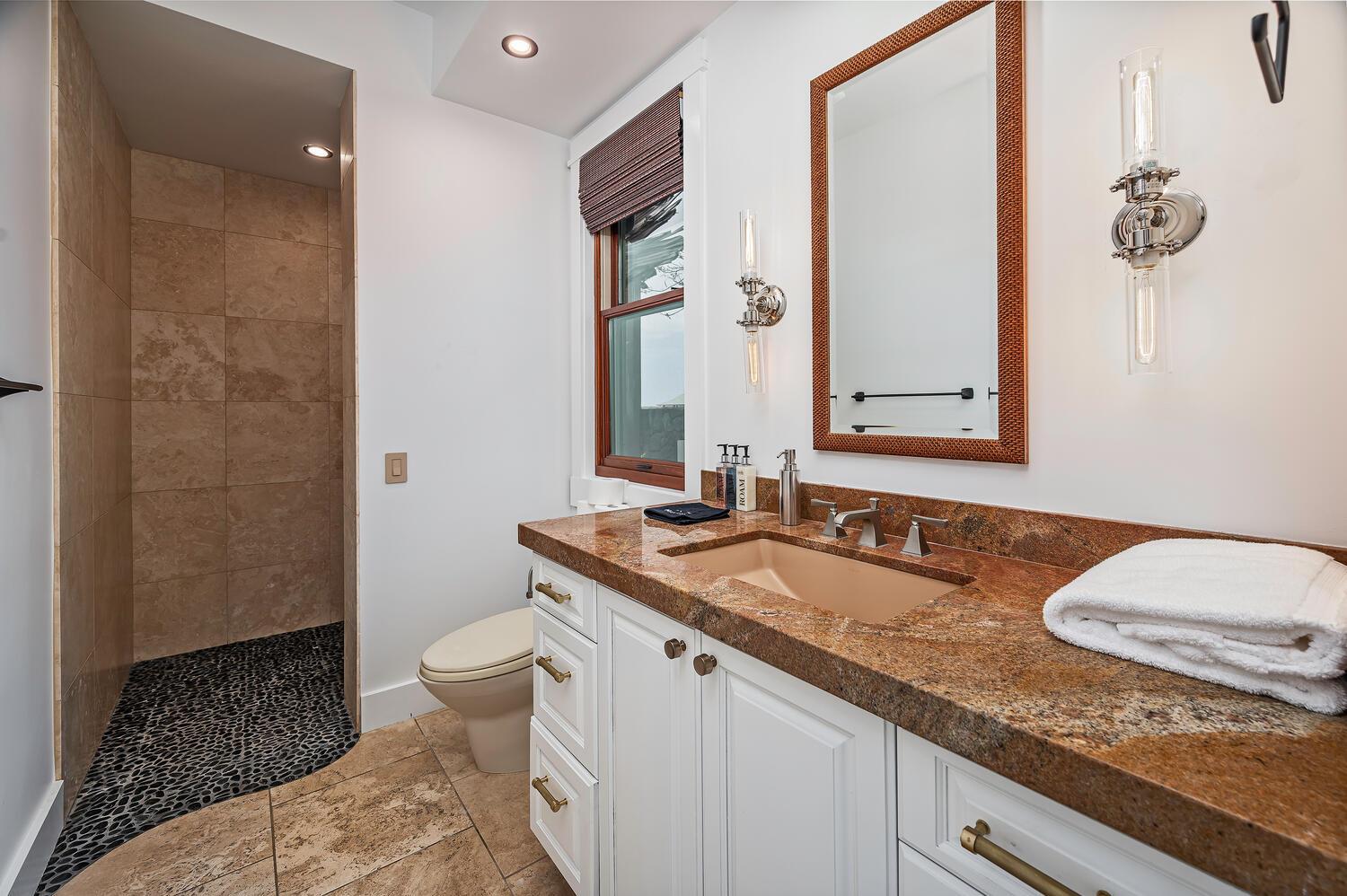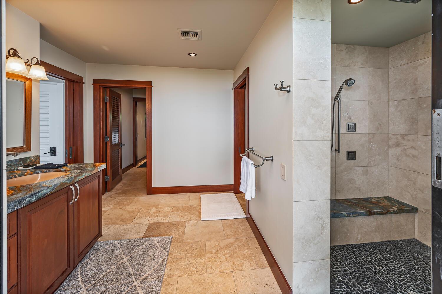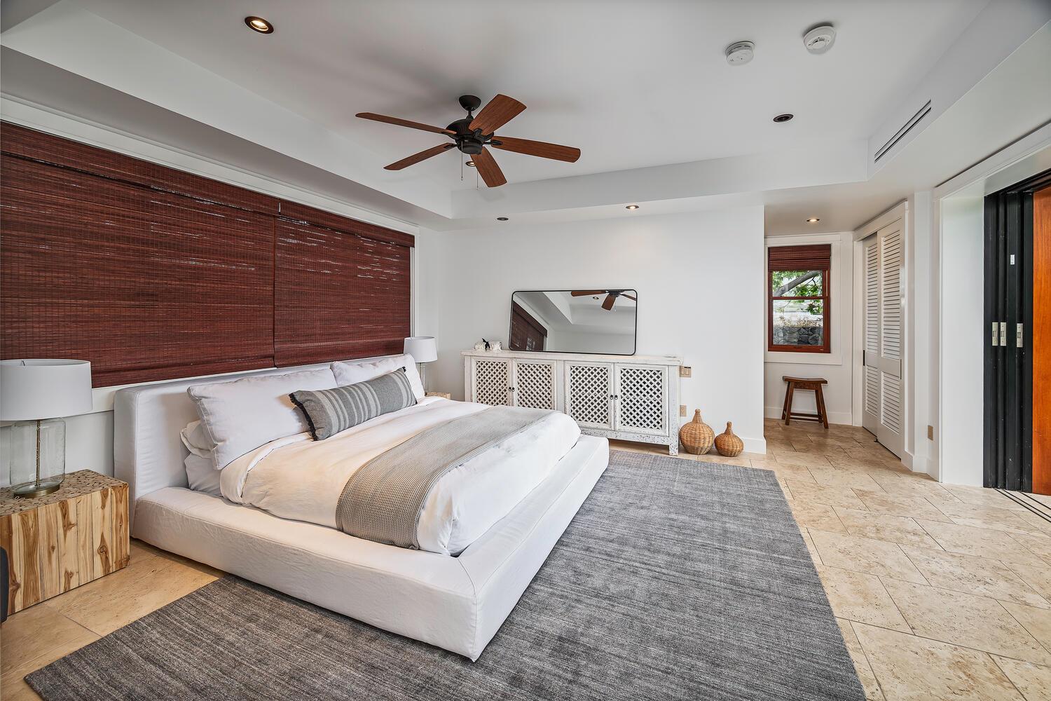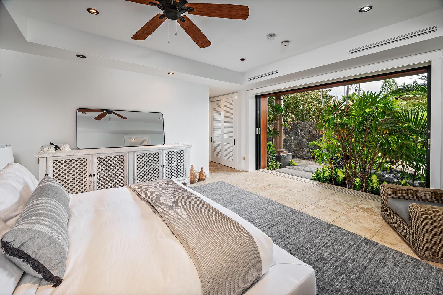 Two sleeping ensuites are on the main level with full en-suite bathrooms. 1st Floor Master set next to manicured lawns and swaying palm trees with RH outdoor furniture including daybed and hanging chair. The other first floor bedroom sits directly off the courtyard ponds so you feel like you are sleeping in a tropical rainforest. The second floor hosts two bedroom en suites that are accessed by the grand spiral staircase. 2nd Floor Master has a huge outdoor lanai with views for miles and outdoor Restoration Hardware furniture with oversized lounge chairs and chaise lounges. The other bedroom on the 2nd floor is a detached Ohana suite for the upmost of privacy and full bath en-suite.  The third floor is comprised of an oversized open air bedroom loft. It in  a private powder room and a kitchenette with small refrigerator and coffee maker. There are two lanais on either side of the loft, providing amazing ocean sunset from one and the sun rising over the mountains in the morning. A shower/bathroom exclusively dedicated to the third floor is at the entry to the loft.