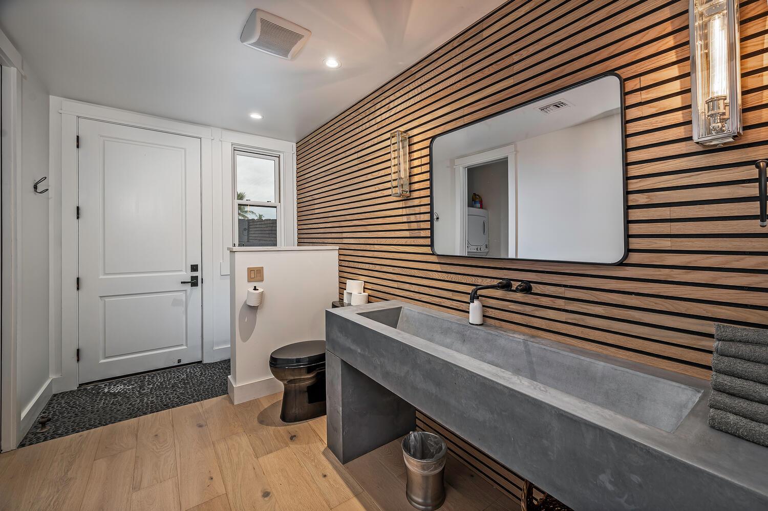 Half bath off living room has a custom designed concrete trough sink and modern designed wood slat wall panels. Outdoor shower connects to this half bath...